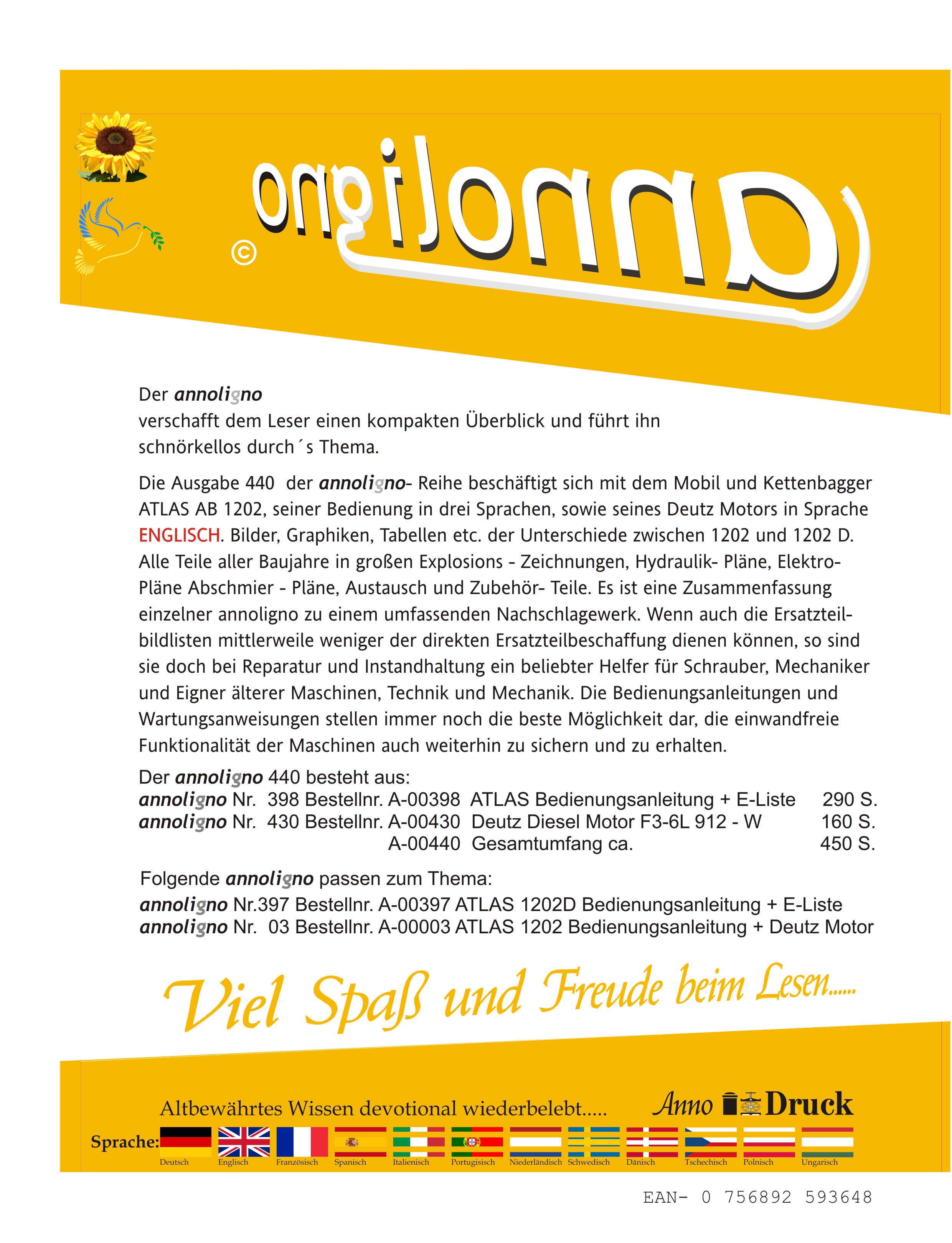 ATLAS Bagger AB 1202 & Motor Deutz F3-6L 912 Bild- Bedienungsanleitung & Wartungsanweisung & Bild Ersatzteilliste & Englisch -- annoligno 440