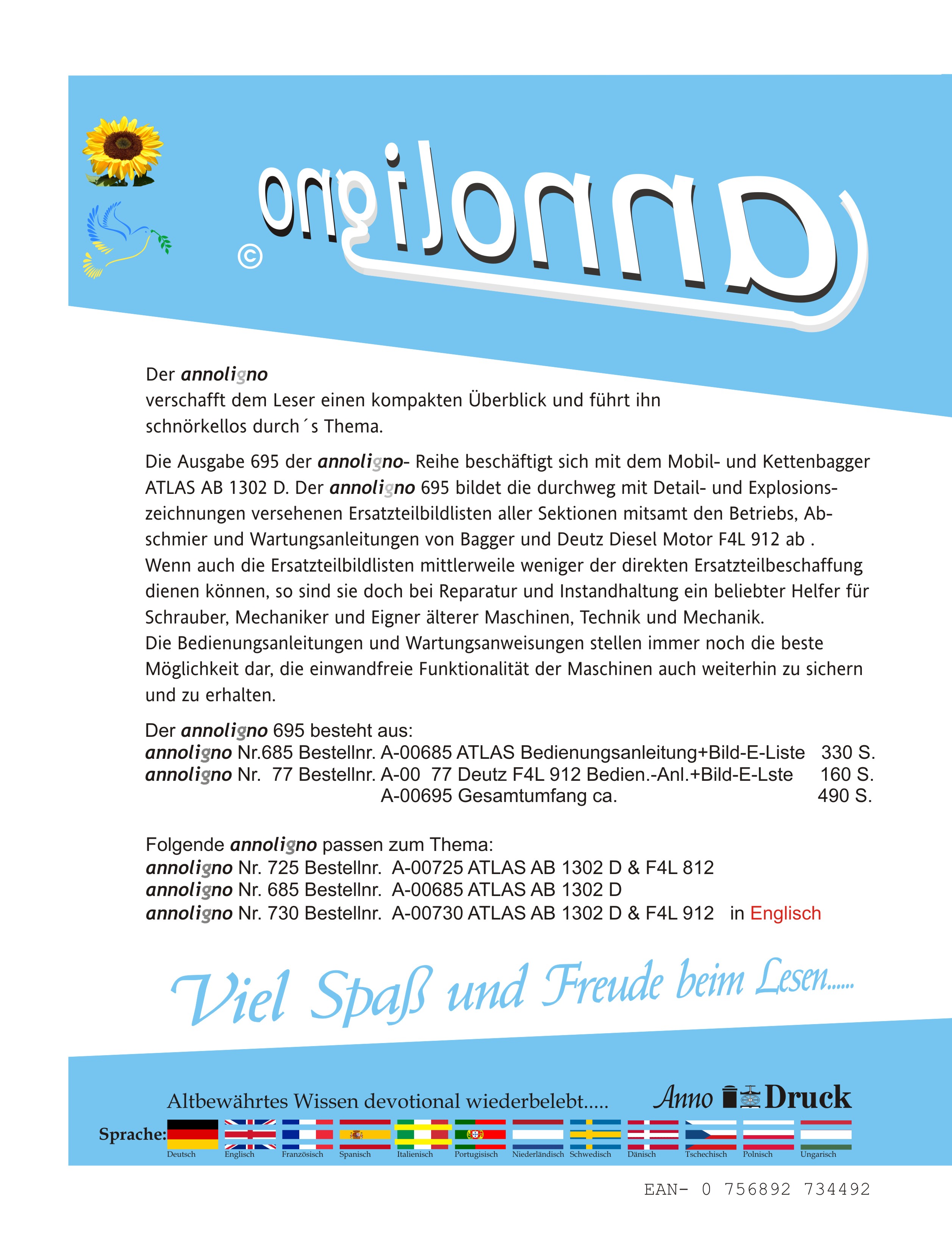 ATLAS Bagger AB 1302 D & Deutz Motor F4L 912 Bedienungsanleitungen & Bild- Ersatzteillisten mit Explosionzeichnungen - annoligno 695