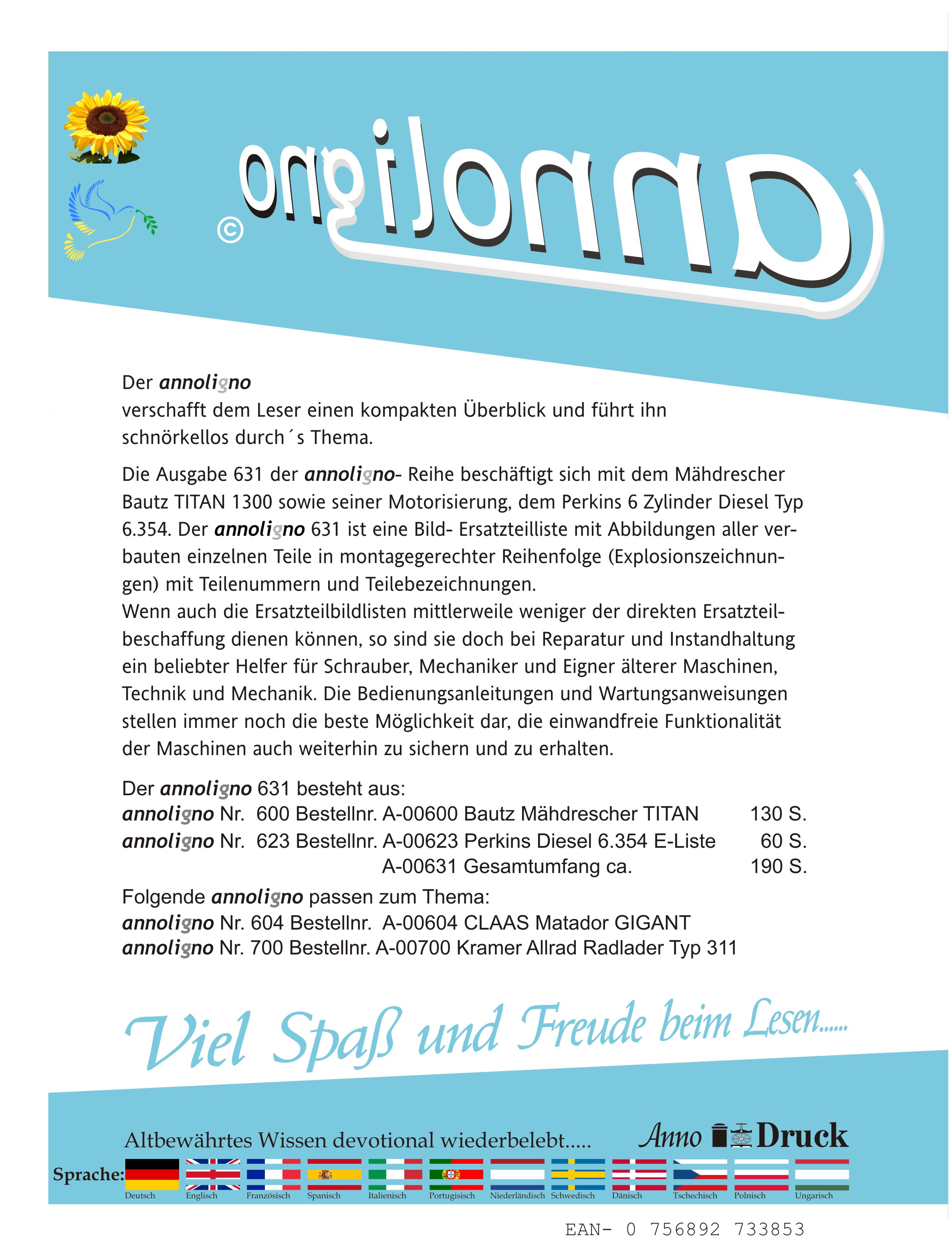 Bautz Mähdrescher Typ TITAN 1300 & Perkins Diesel Motor Typ 6.354 Bild Ersatzteilliste & Explosionszeichnungen - annoligno 631