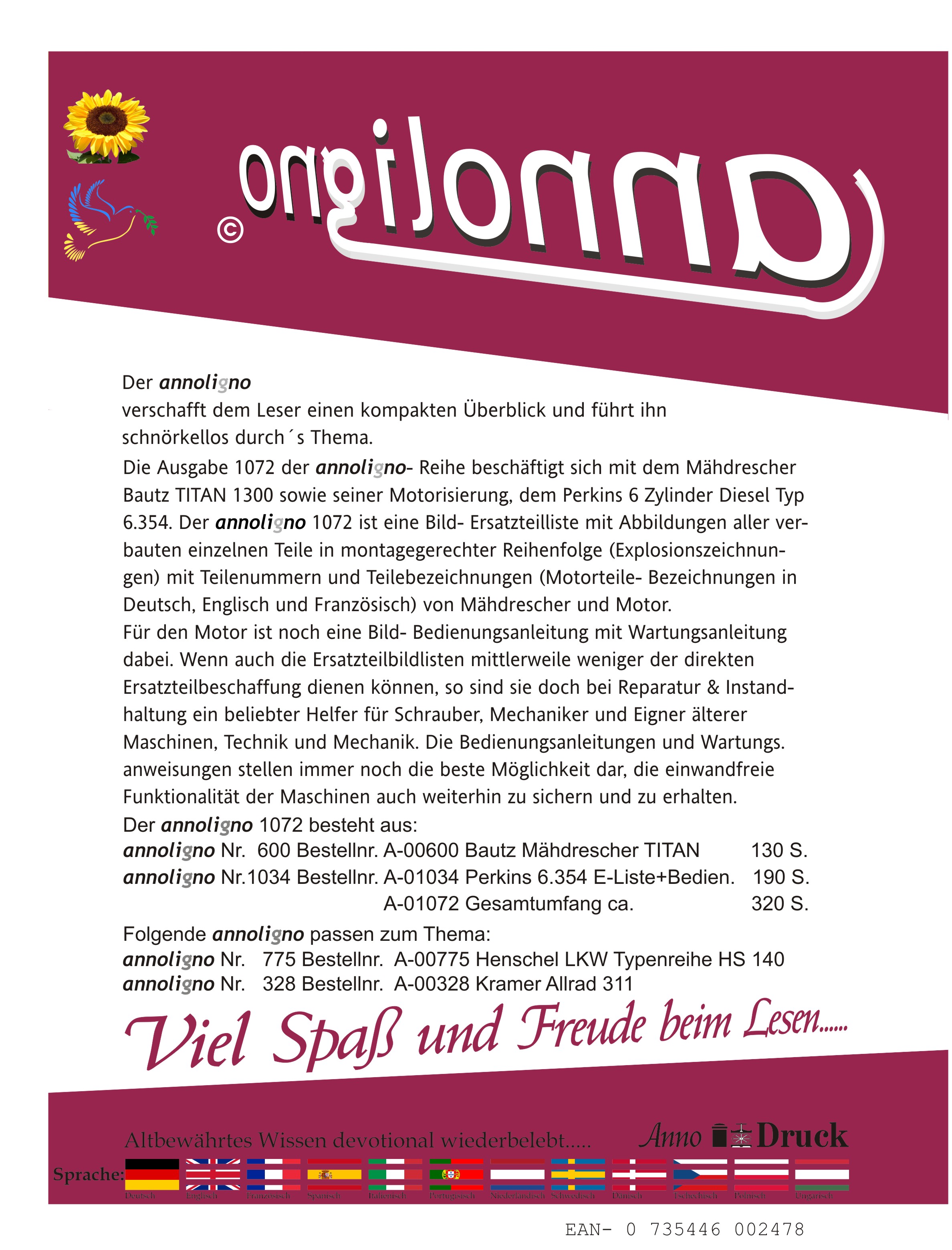 Bautz Mähdrescher TITAN 1300 & Perkins Motoren Typ 6.354 Bild- Bedienungsanleitung & Bild – Ersatzteilliste & Explosionszeichnungen & in drei Sprachen - annoligno 1072