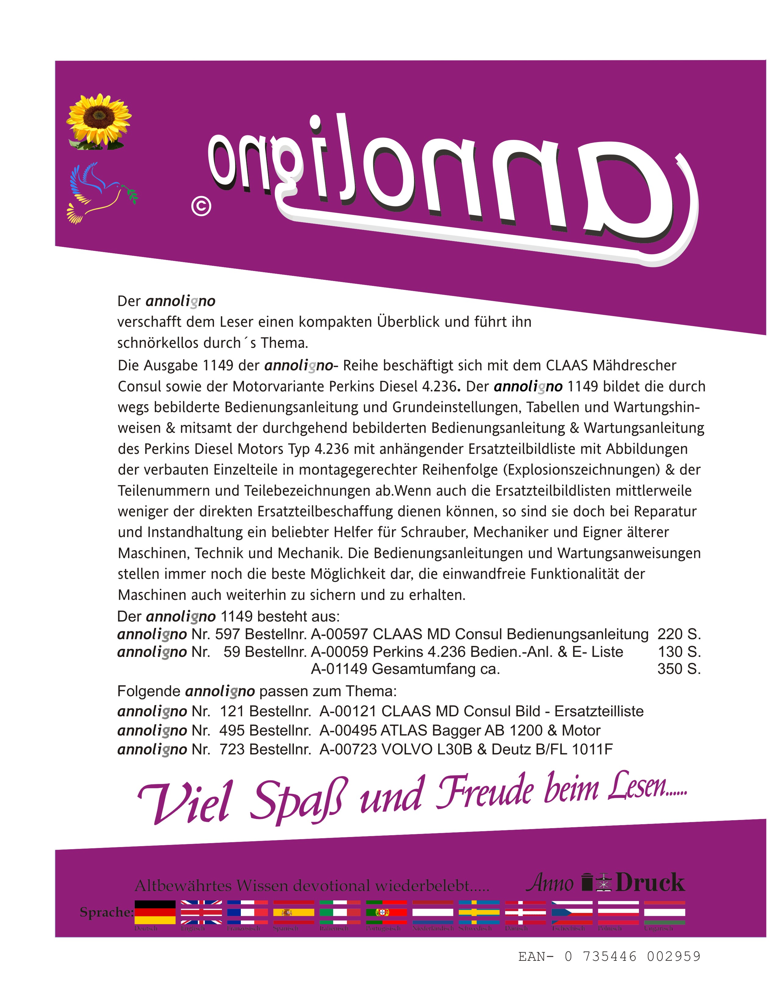 CLAAS Mähdrescher Consul & Perkins Diesel 4.236 Bild Bedienungsanleitung-en + Bild- Ersatzteilliste mit Explosionszeichnungen von Motor - annoligno 1149
