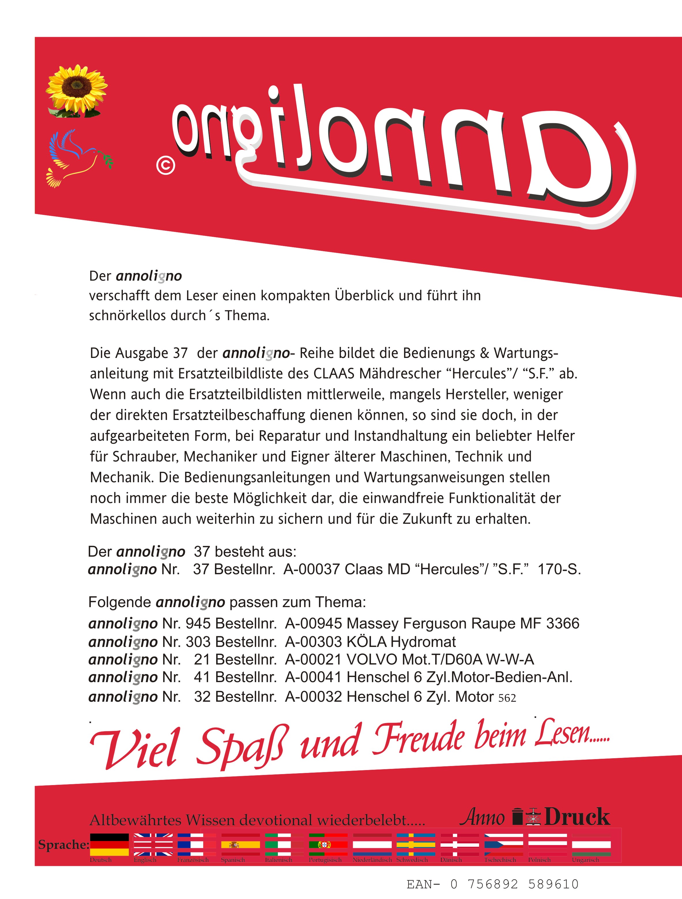 CLAAS Mähdrescher Hercules/S.F. Bild- Ersatzteilliste & Bedienungsanleitung & Wartungsanleitung - annoligno 37