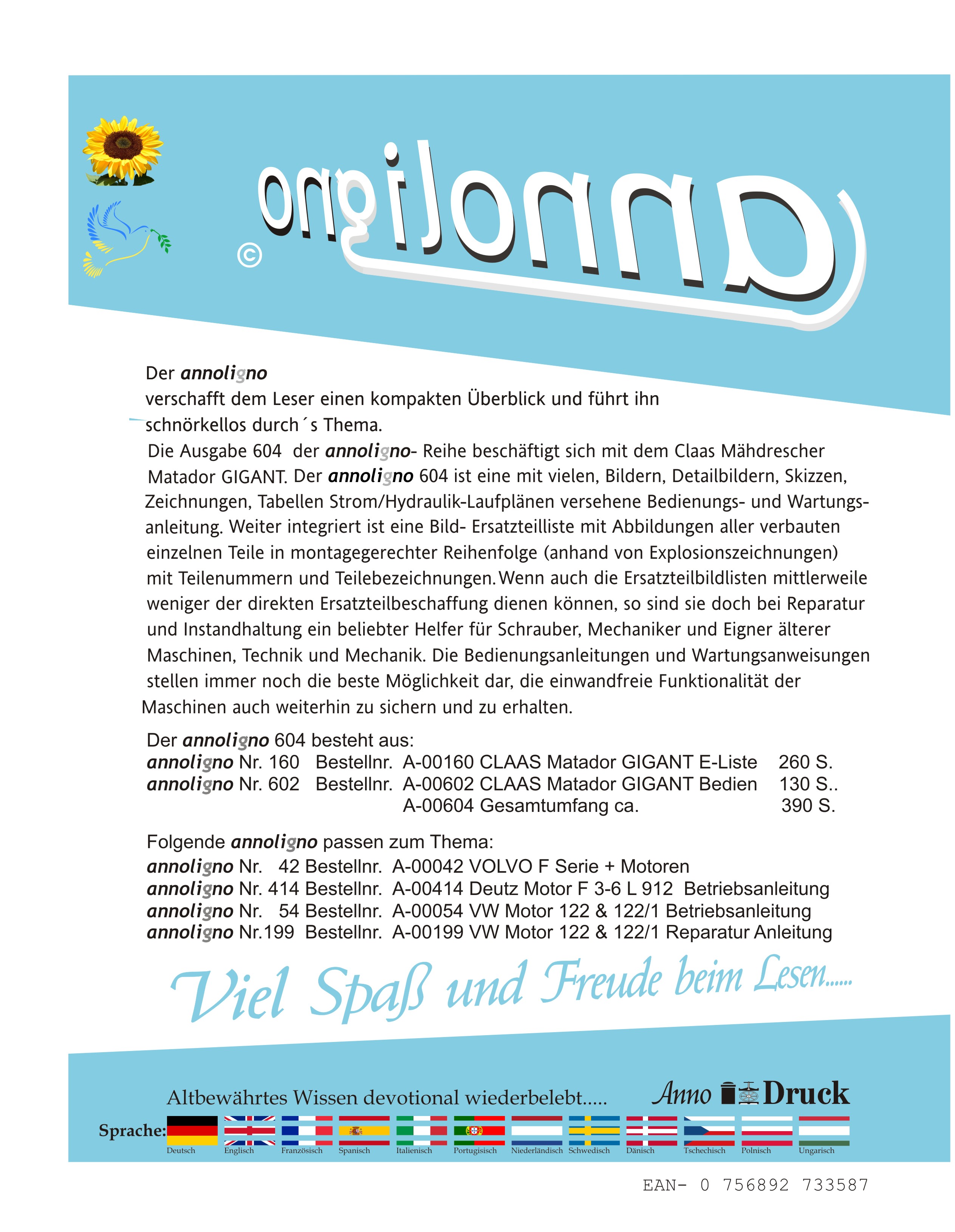 CLAAS Mähdrescher Typ Matador GIGANT Bild- Bedienungsanleitung & Wartungsanleitung & Bild- Ersatzteilliste & Explosionszeichnungen - annoligno 604