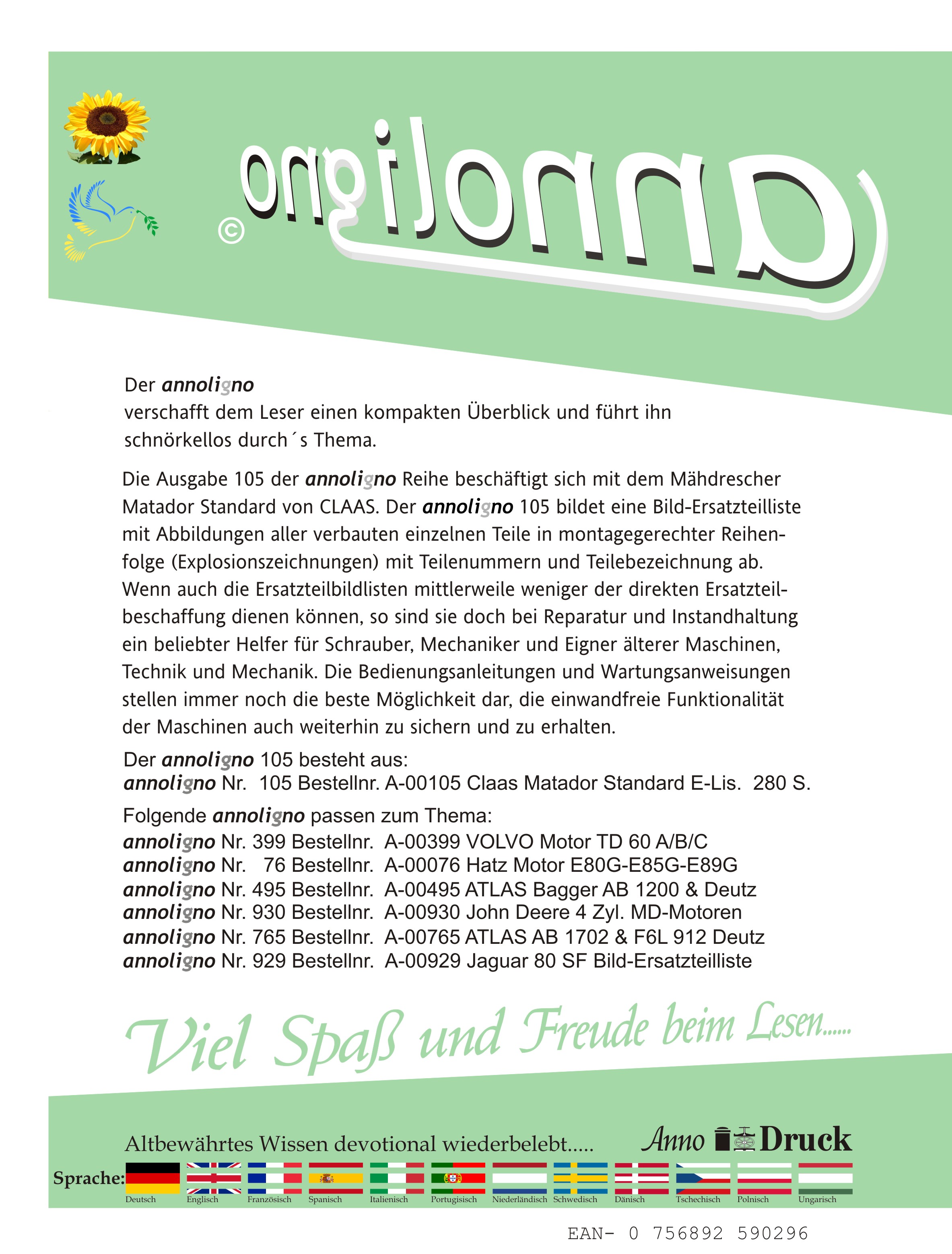 CLAAS Mähdrescher Matador Standard Bild- Ersatzteilliste mit (Explosionszeichnungen) - annoligno 105