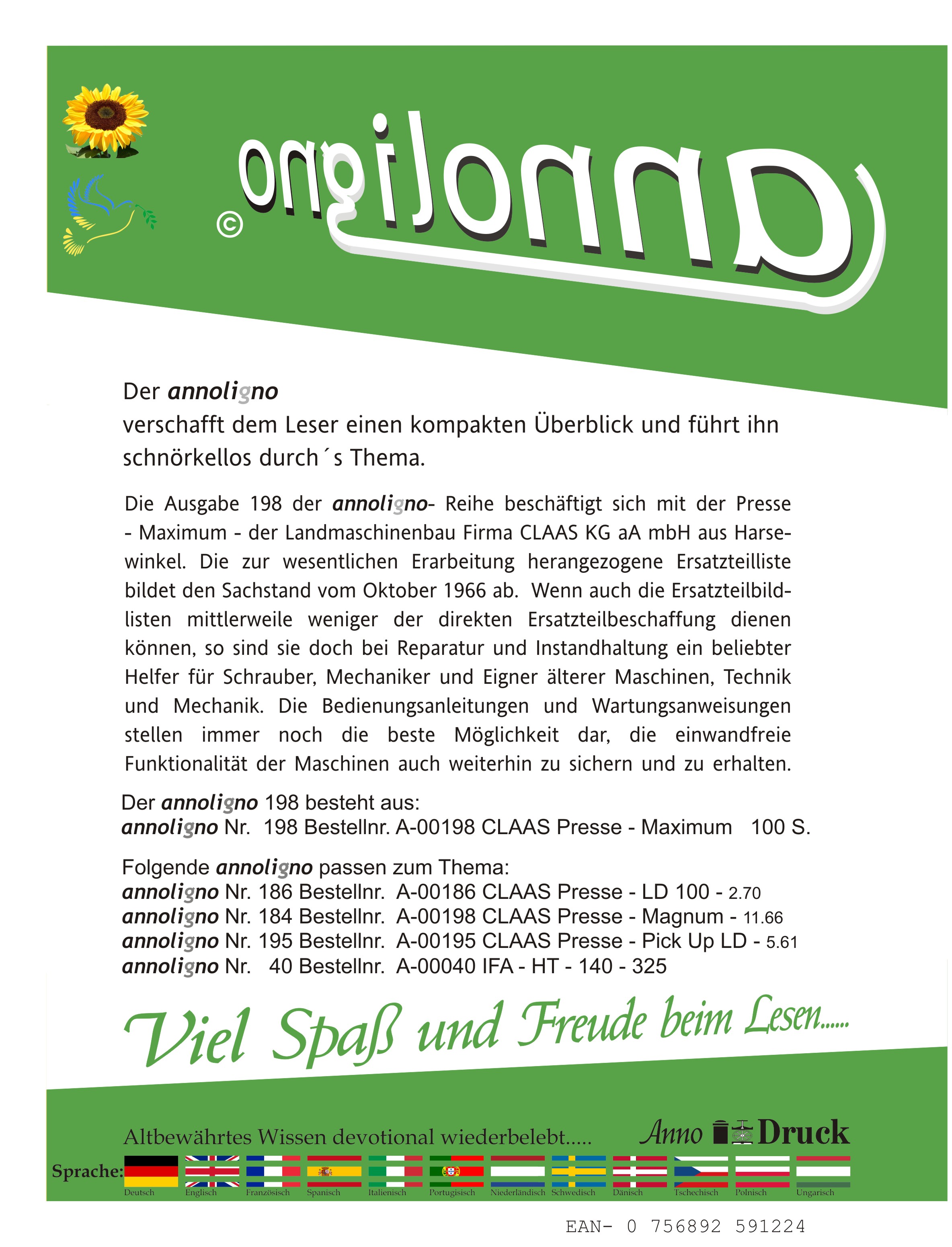 Angaben zur Produktsicherheit (GPSR): Artikelnummer: A-00198 CLAAS Presse Typ Maximum Bild- Ersatzteilliste & Explosionszeichnungen Hersteller: AnnoDruck, Robert Haas, Oberthalham 6 Annohof, 94542 Haarbach, annodruck.r.haas@annohof.de