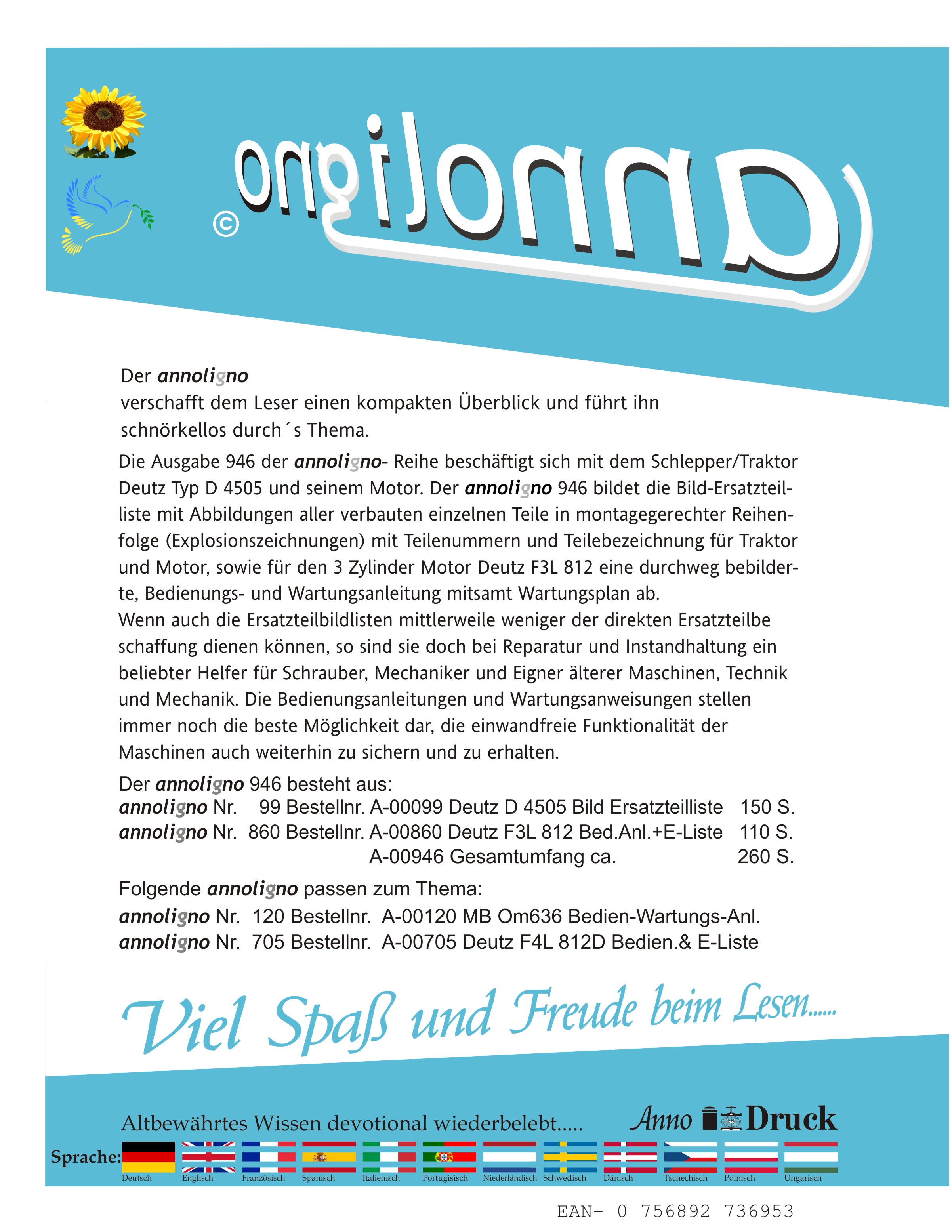 Deutz Traktor Schlepper Zugmaschine D 4505 Bild- Ersatzteilliste & Motor F3L 812 Bilder- Bedienungsanleitung & Wartungsanleitung annoligno 946
