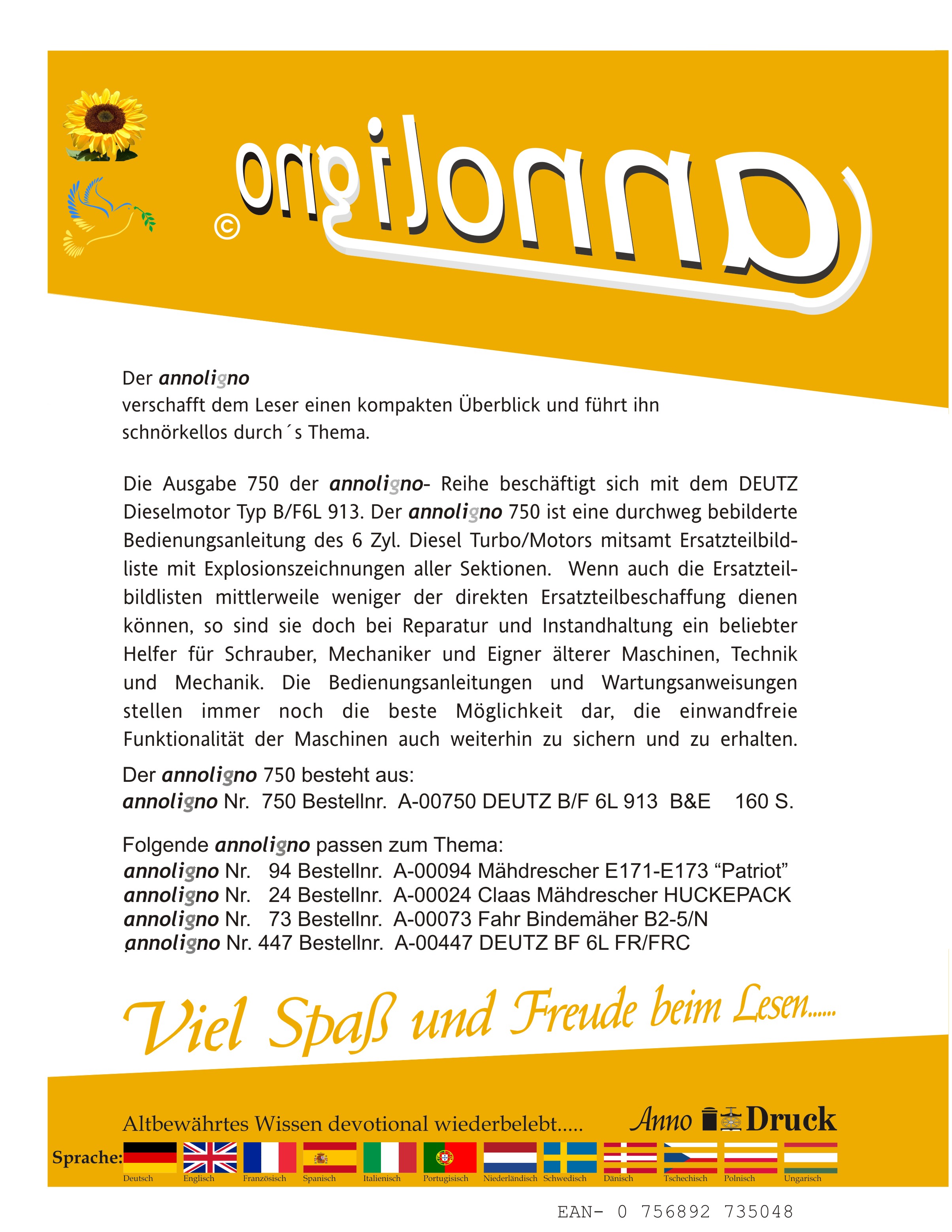 Deutz Diesel Motor Typ B/F6L 913 Bild- Bedienungsanleitung & Wartungsanleitung & Bild- Ersatzteilliste & Explosionszeichnungen - annoligno 750
