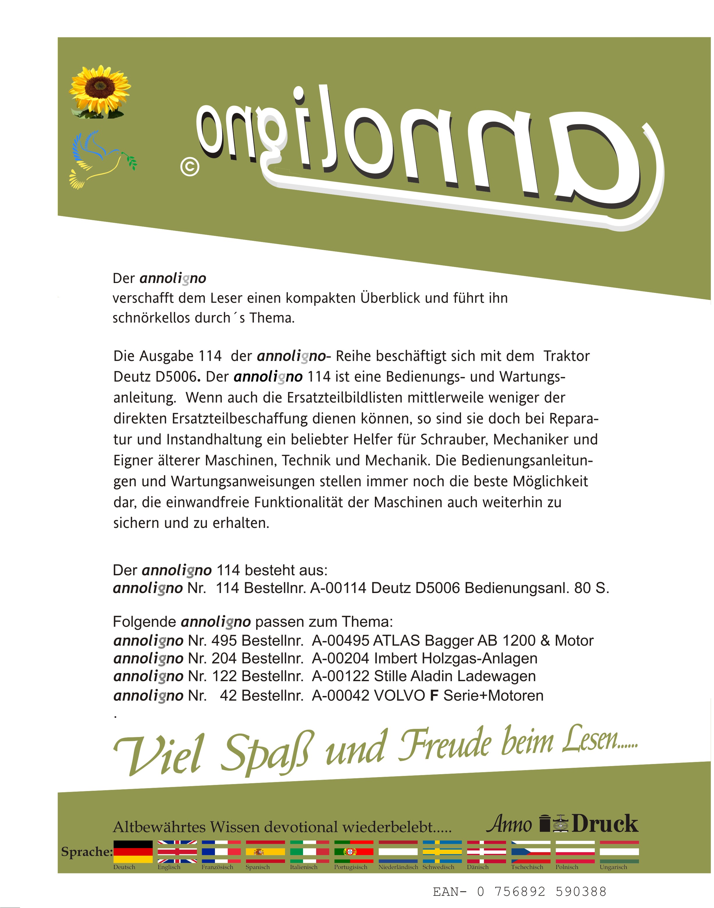Deutz Traktor Zugmaschine Typ D5006 Bild- Bedienungsanleitung & Wartungsanleitung - annoligno 114