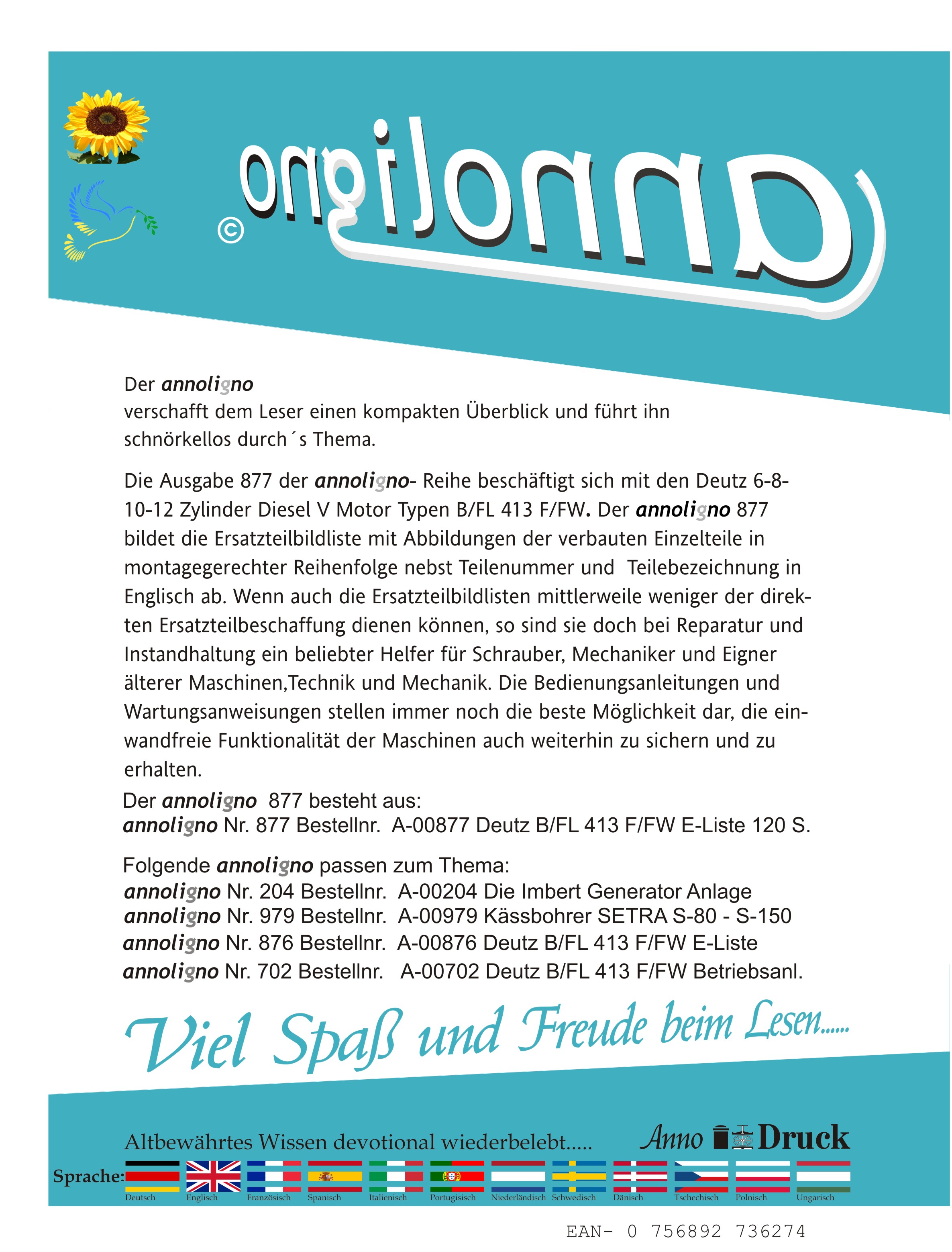 Deutz Diesel V-Motor Serie B/FL 413 F/FW 6-12 Zylinder 1980 Ersatzteilliste & Explosionszeichnungen ENGLISCH - annoligno 877