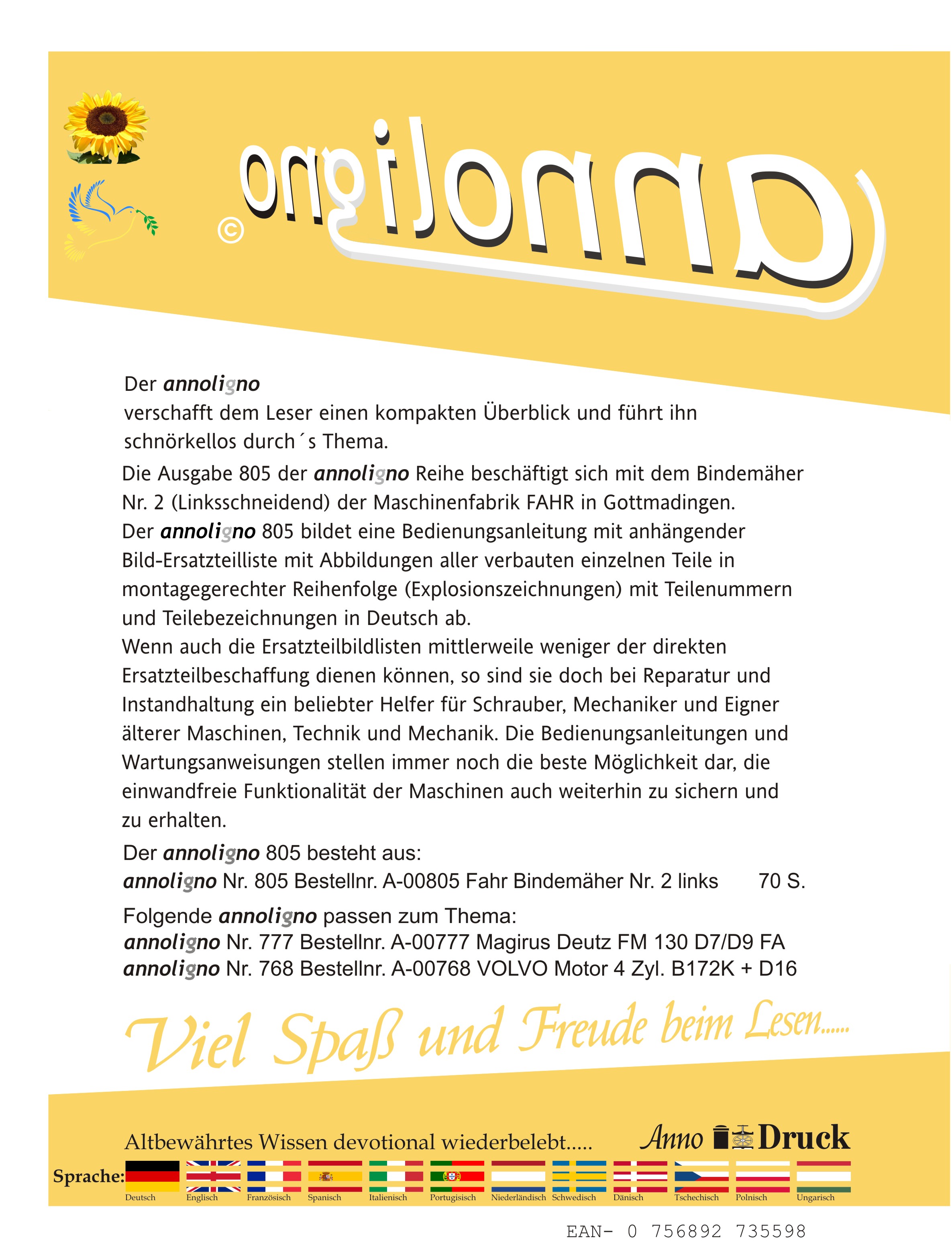 FAHR Bindemäher Typ Nr. 2 (Linksschneidend) Bild- Bedienungsanleitung & Bild- Ersatzteilliste & Explosionszeichnungen - annoligno 805
