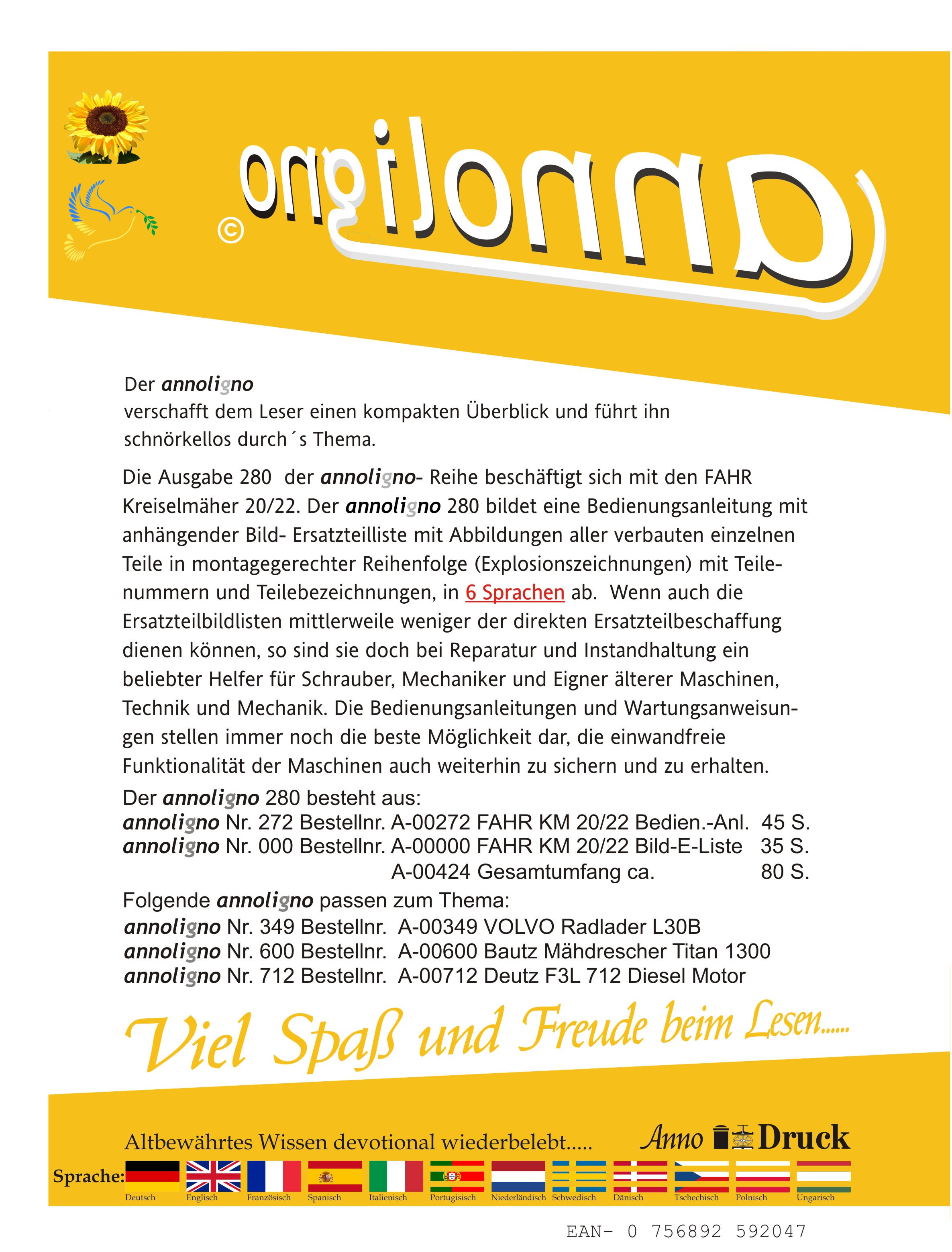 FAHR Kreiselmäher Typ 20/22 Bild- Bedienungsanleitung & Bild- Ersatzteilliste & Explosionszeichnungen - 22 - annoligno 280