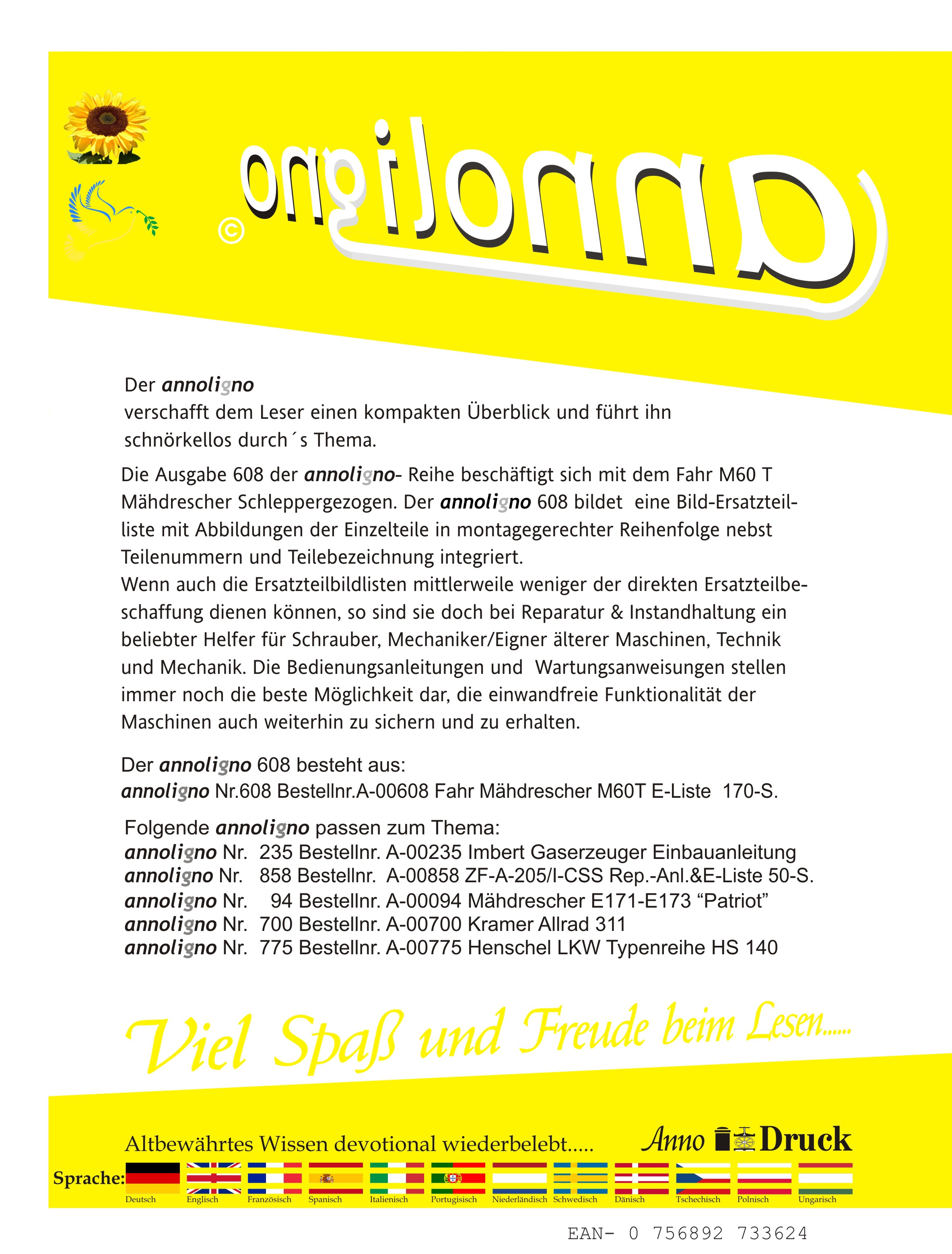 FAHR Mähdrescher Schlepper - gezogen Typ M 60 T Bild- Ersatzteilliste & Explosionszeichnungen - annoligno 608