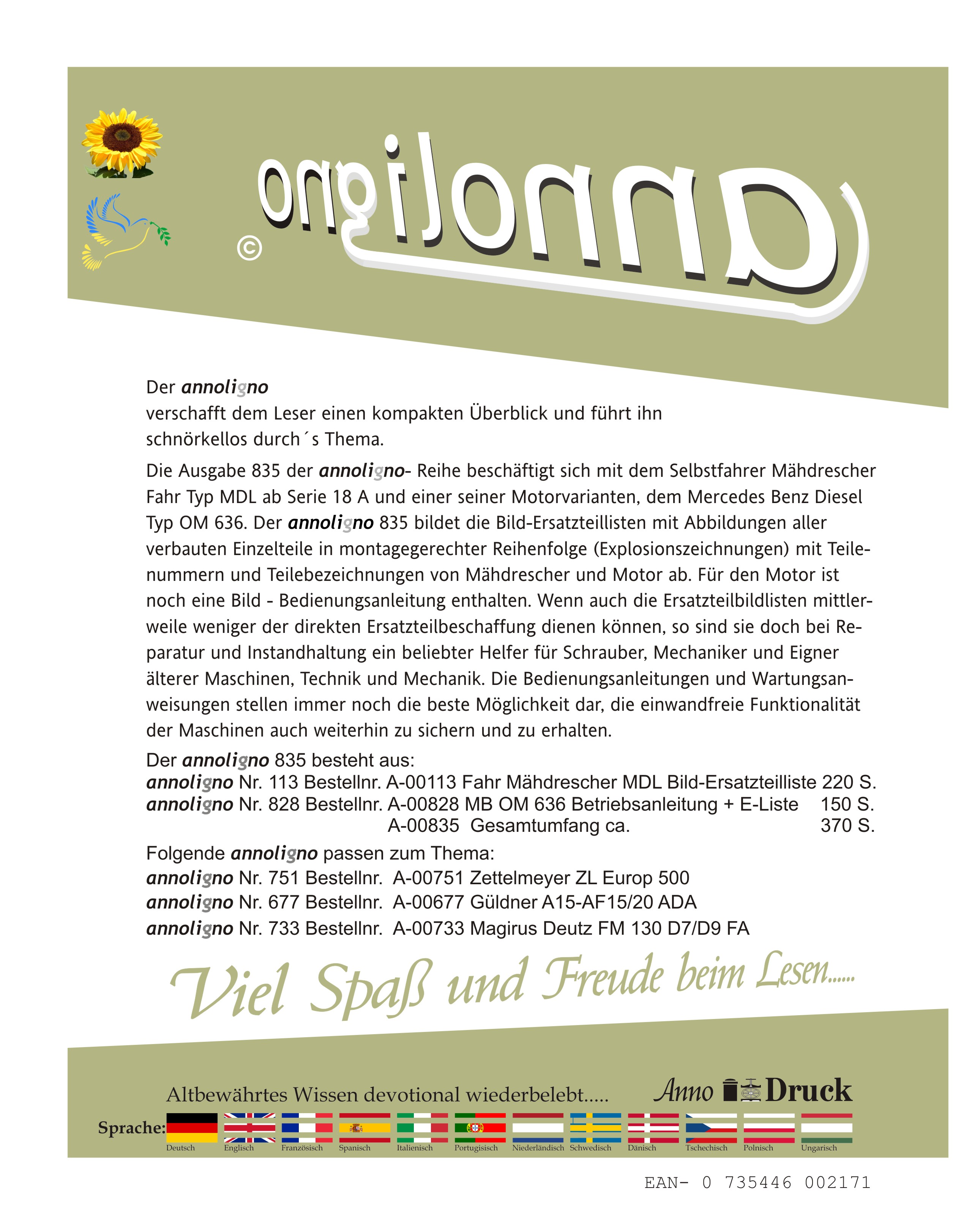 Fahr Mähdrescher Typ MDL & MB Motor Typ OM 636 - Bild- Ersatzteillisten mit Explosionszeichnungen + Motor Bedienungsanleitung - annoligno 835