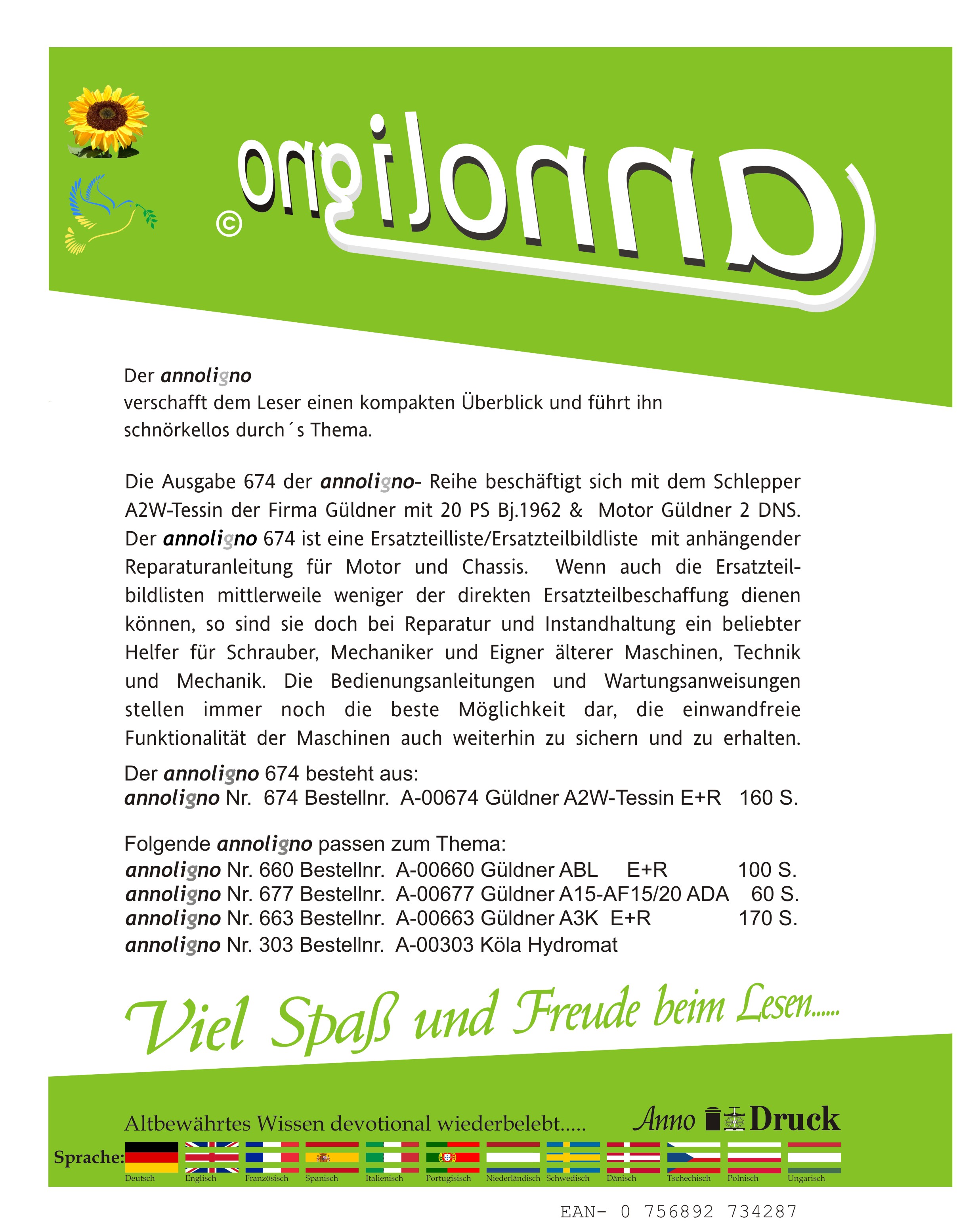 Güldner Traktor/Schlepper Zugmaschine Typ A2W Tessin & Motor Typ 2 DNS Bild- Ersatzteilliste & Explosionszeichnungen & Bild- Reparaturanleitung - annoligno 674