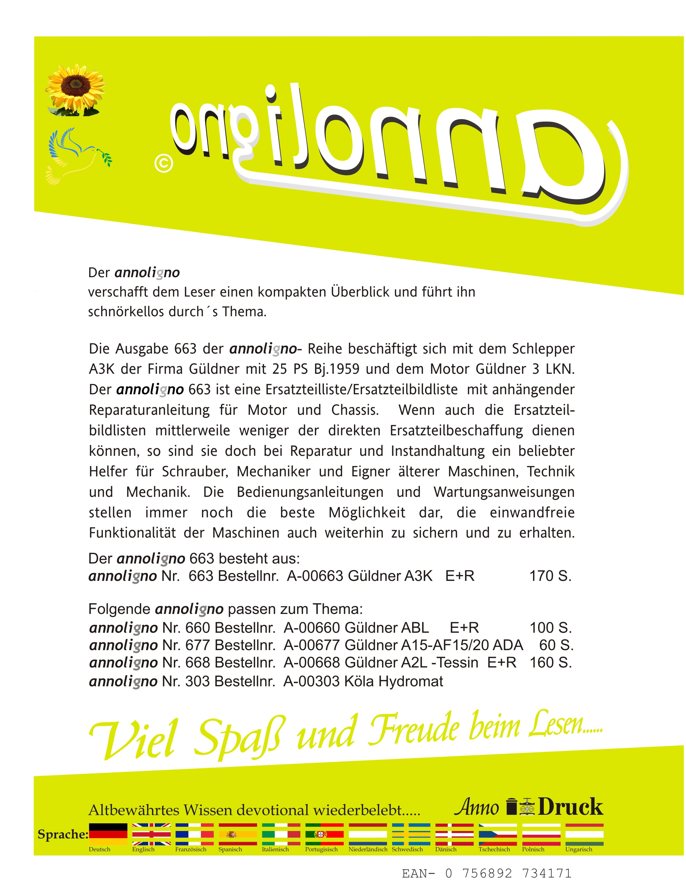 Inhalt: Die Ausgabe 663 der annoligno- Reihe beschäftigt sich mit dem Schlepper A3K der Firma Güldner mit 25 PS Bj.1959 und dem Motor Güldner 3 LKN.Der annoligno 663 ist eine Ersatzteilliste/ Ersatzteilbildliste mit anhängender Reparaturanleitung für Motor und Chassis.