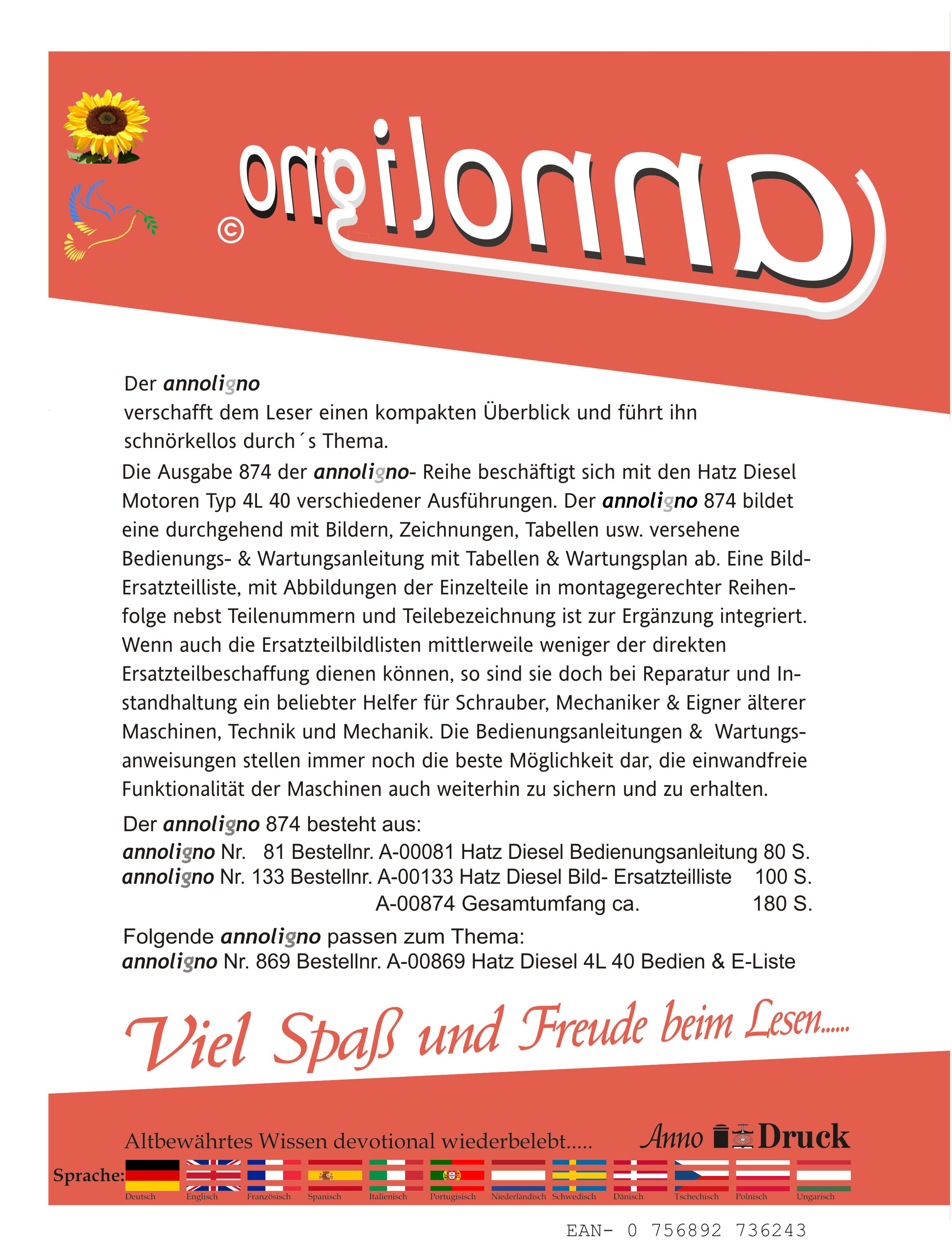 Hatz Diesel Motoren Serie Typ 4L 40 Bild Bedienungsanleitung & Wartungsanleitung & Bild- Ersatzteilliste & Explosionszeichnungen - annoligno 874