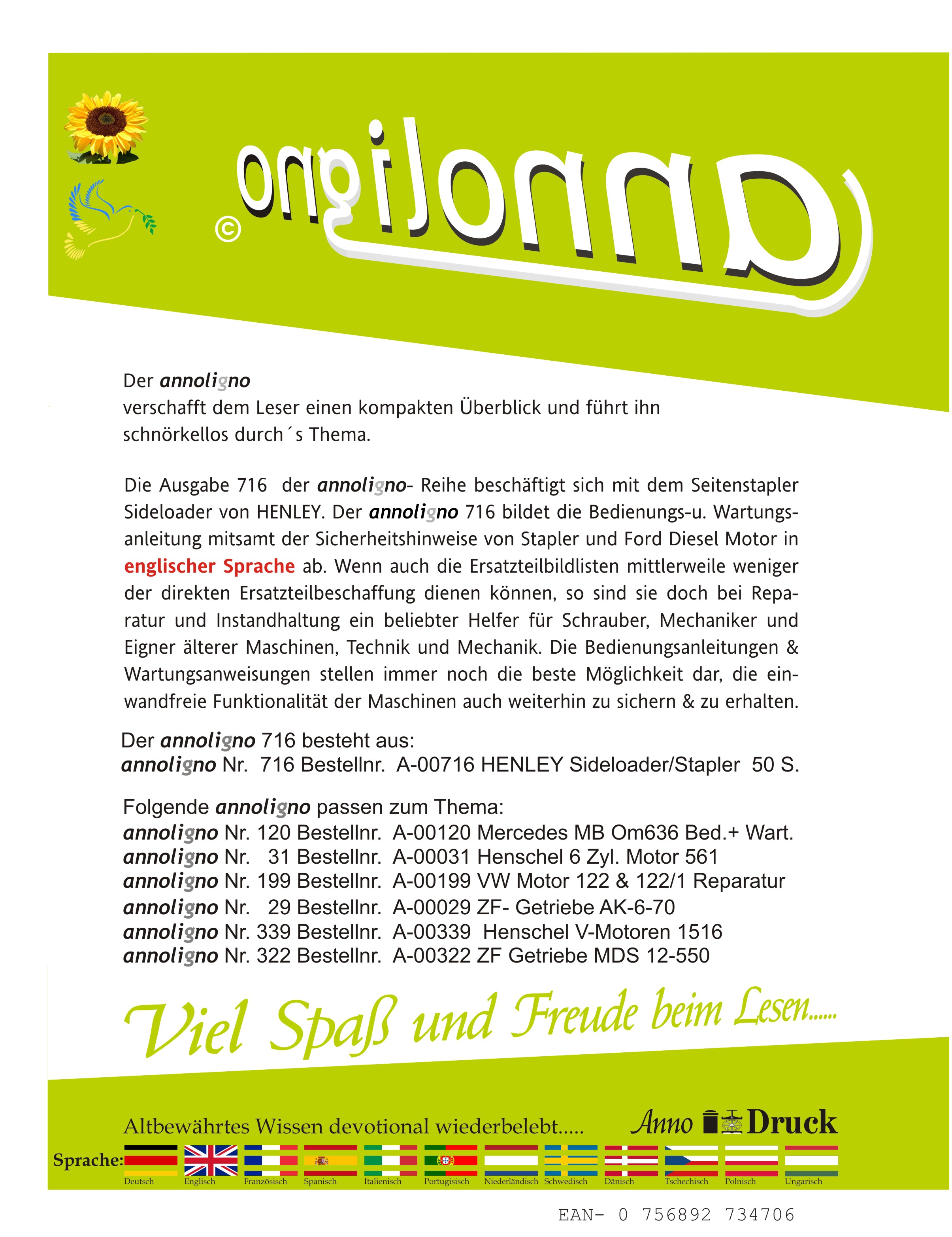 HENLEY Stapler Seitenstapler Sideloader Typ 4/5/6 Tonnen & Ford Diesel Motor Bild Bedienungsanleitung & Wartungsanleitung - annoligno 716