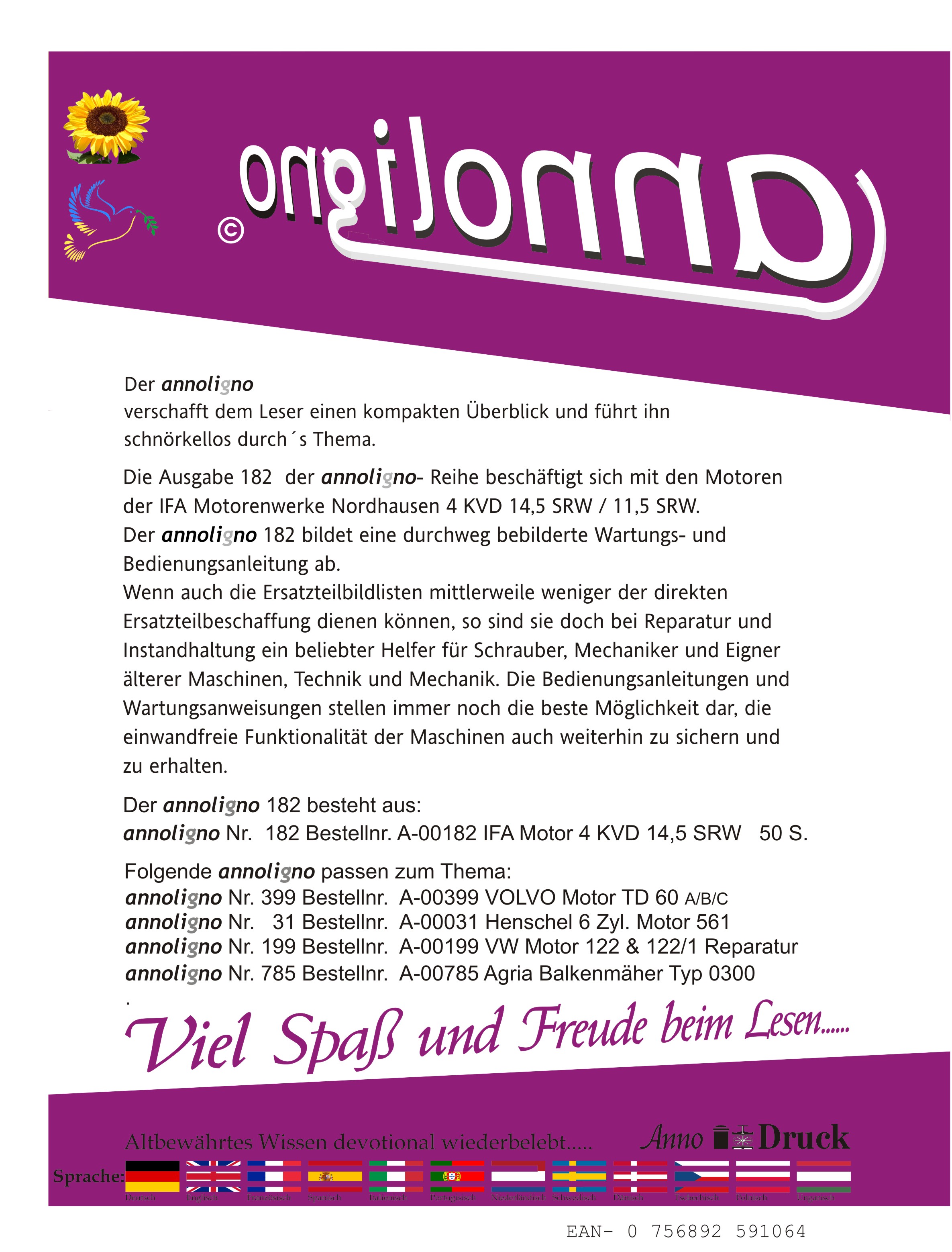 IFA Motorenwerke Nordhausen Typ 4 KVD 14,5 SRW/11,5 SRW Bild- Bedienungsanleitung & Wartungsanleitung - annoligno 182