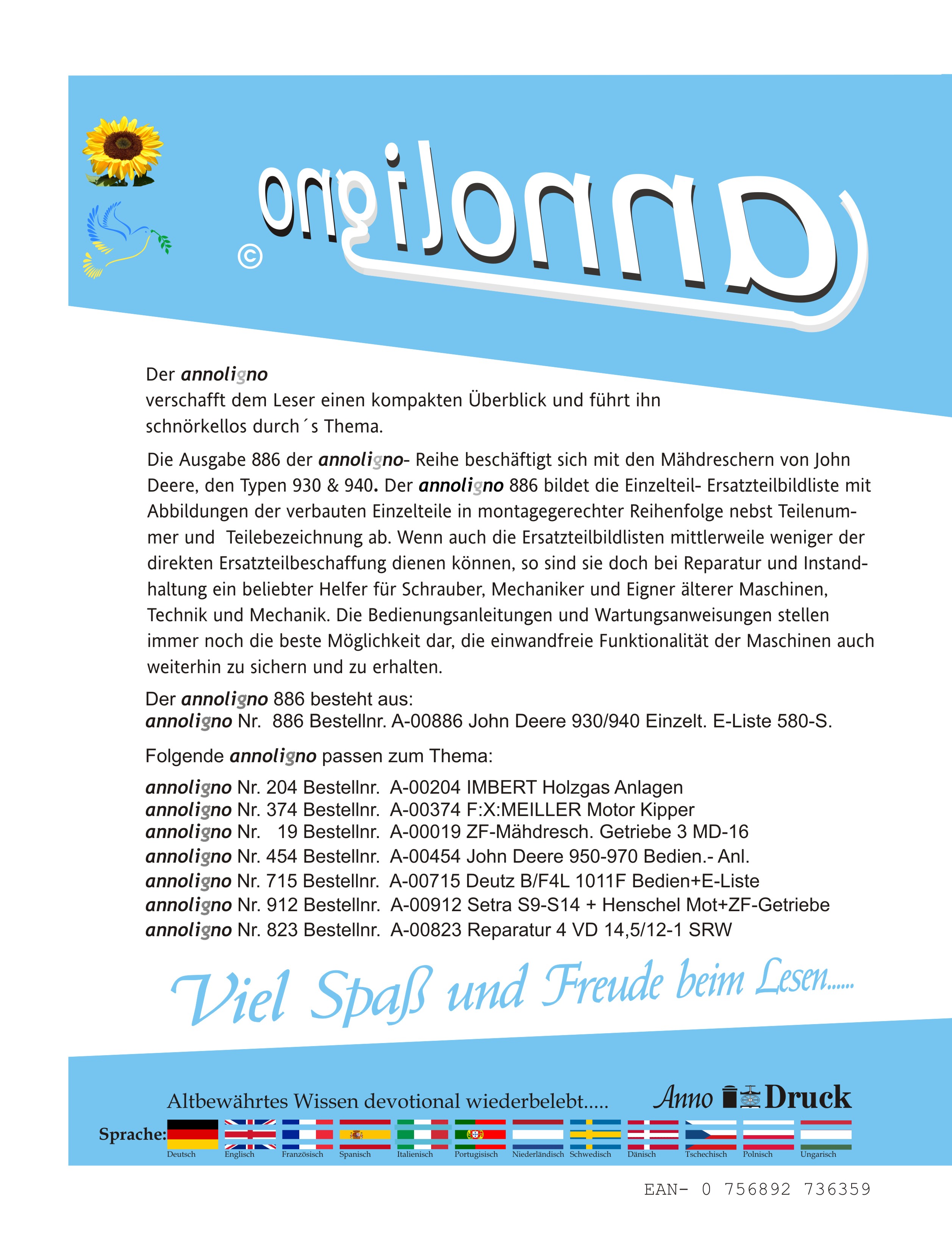 John Deere Mähdrescher Typen 930 & 940 Bild- Ersatzteilliste & Explosionszeichnungen - annoligno 886