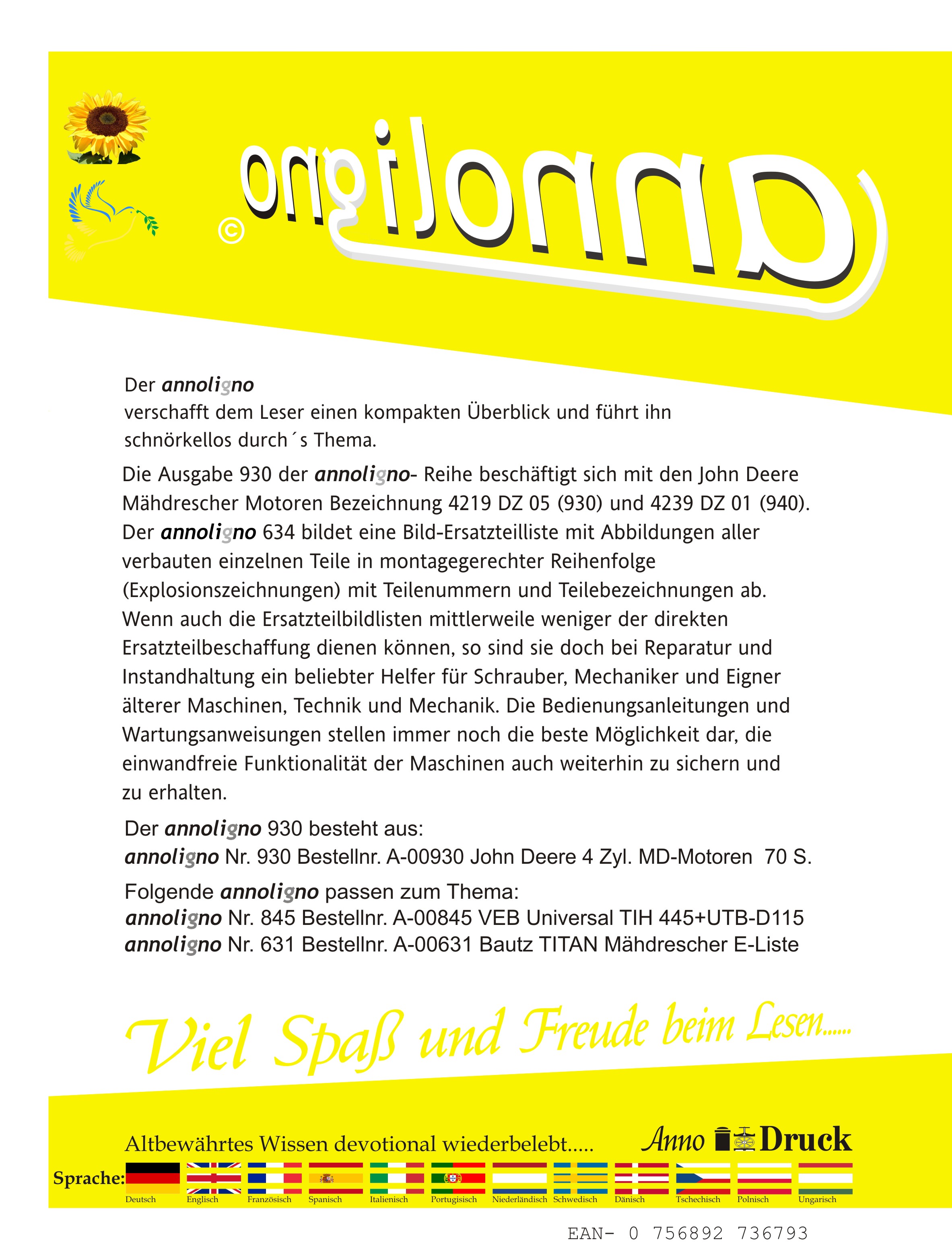 John Deere 4 Zylinder Mähdrescher Motoren Typen 4219 DZ 05 (930) & 4239 DZ 01 (940) Bild- Ersatzteilliste & Explosionszeichnungen - annoligno 930