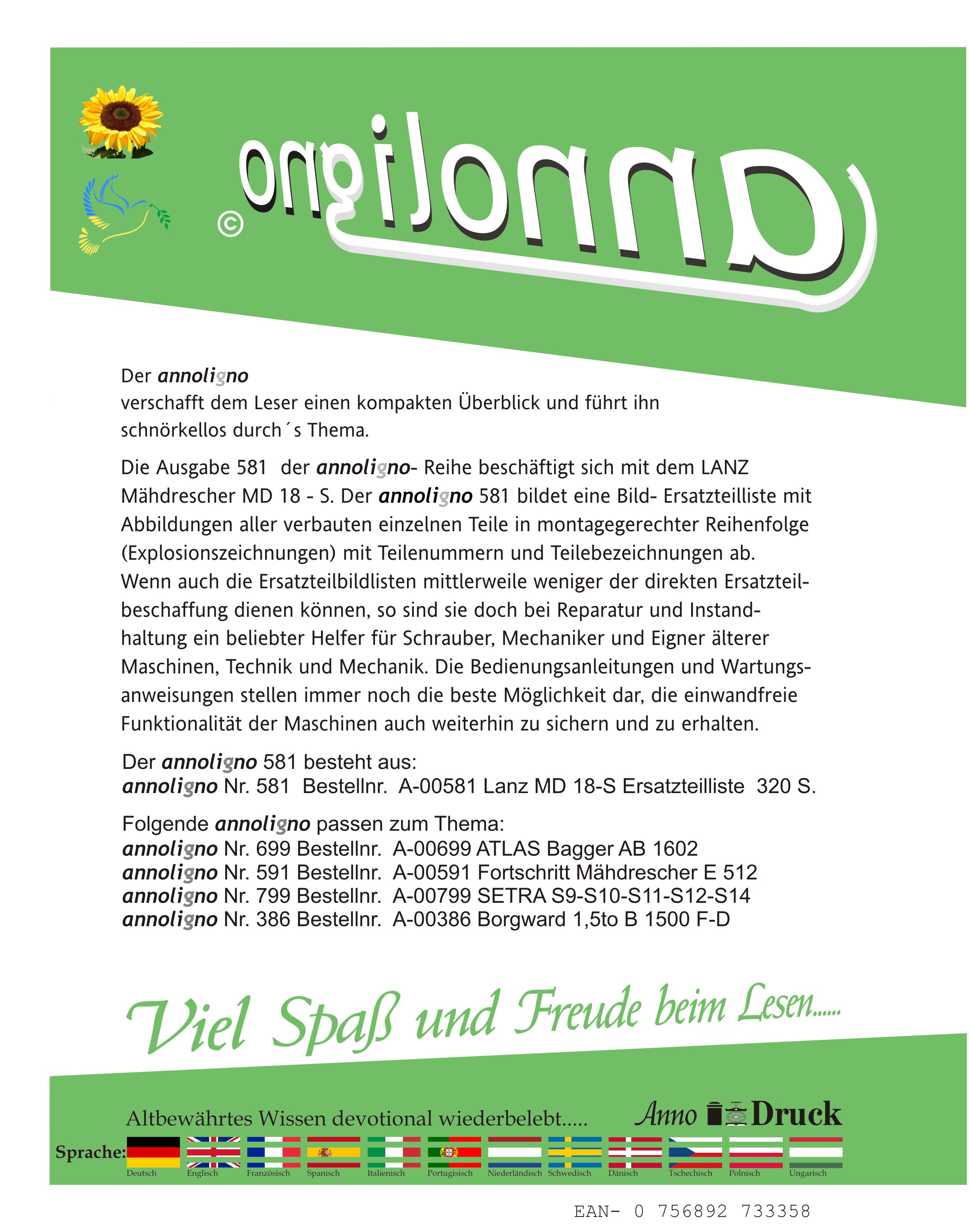 Lanz Mähdrescher Typ MD 18 - S Bild- Ersatzteilliste & Explosionszeichnungen - annoligno 581