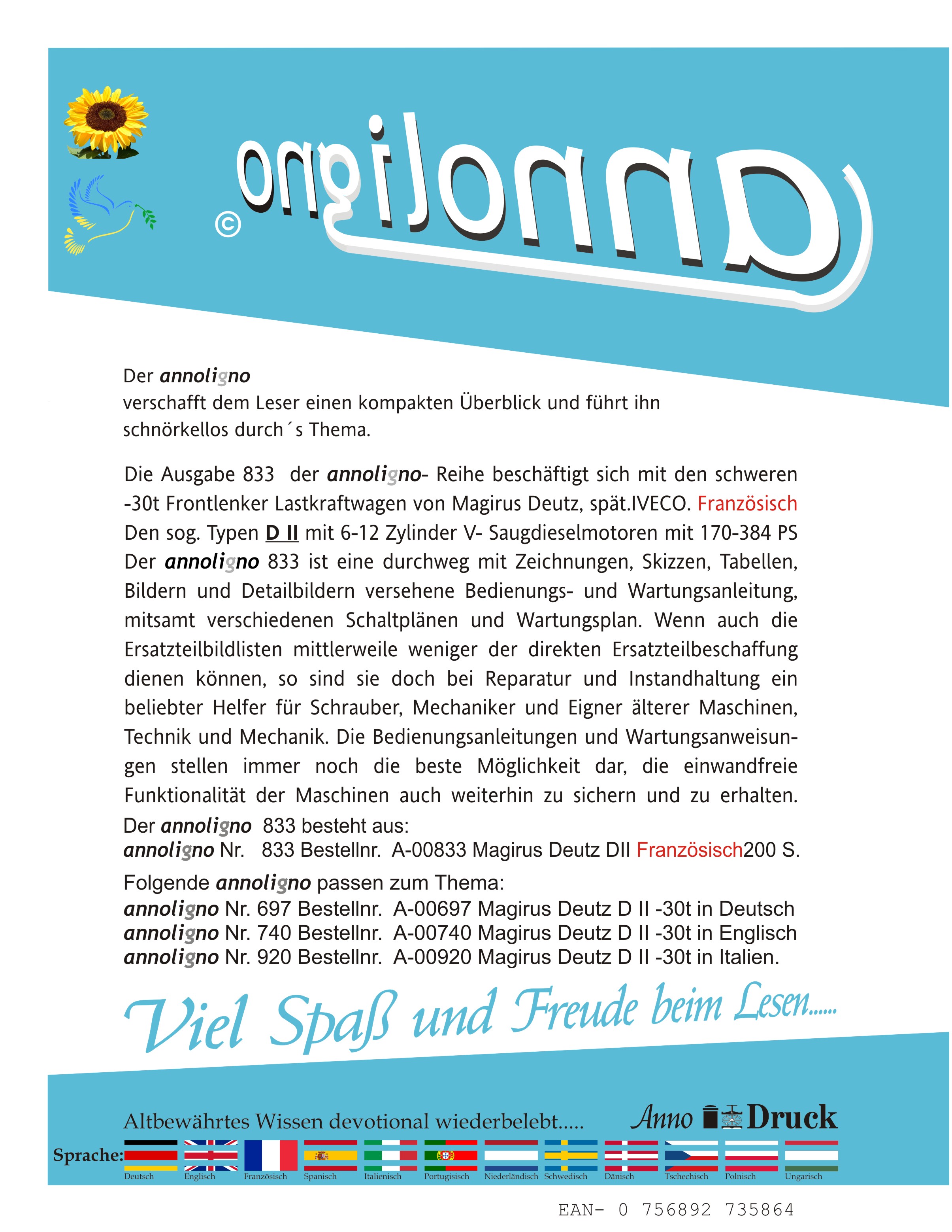 Magirus Deutz/IVECO Frontlenker LKW D II 30 to. & 6-12 Zylinder V- Diesel Motor Bild- Bedienungsanleitung - annoligno 833