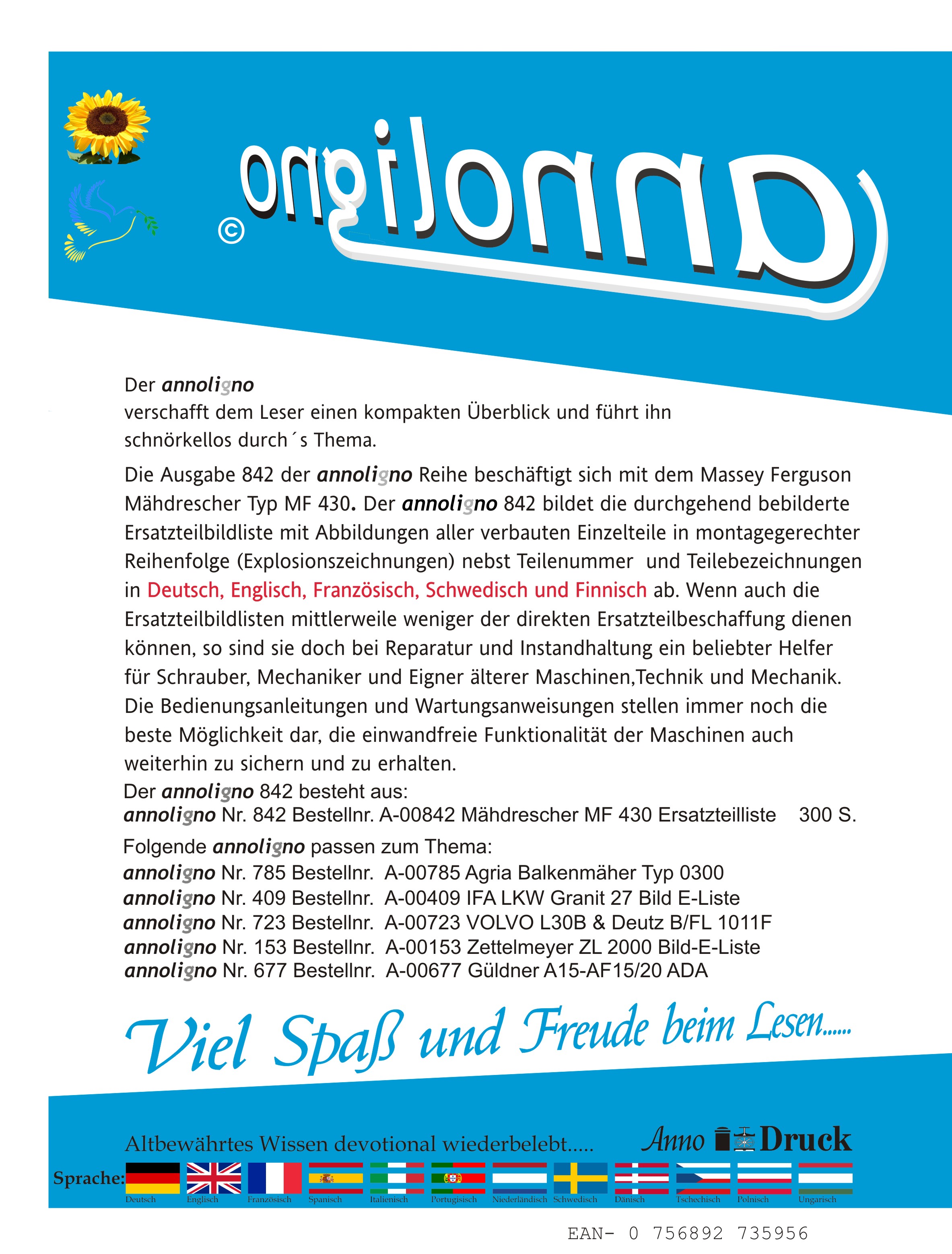 Massey Ferguson Mähdrescher Typ MF 430 Bild Ersatzteilliste mit Explosionszeichnungen in 5 Sprachen - annoligno 842