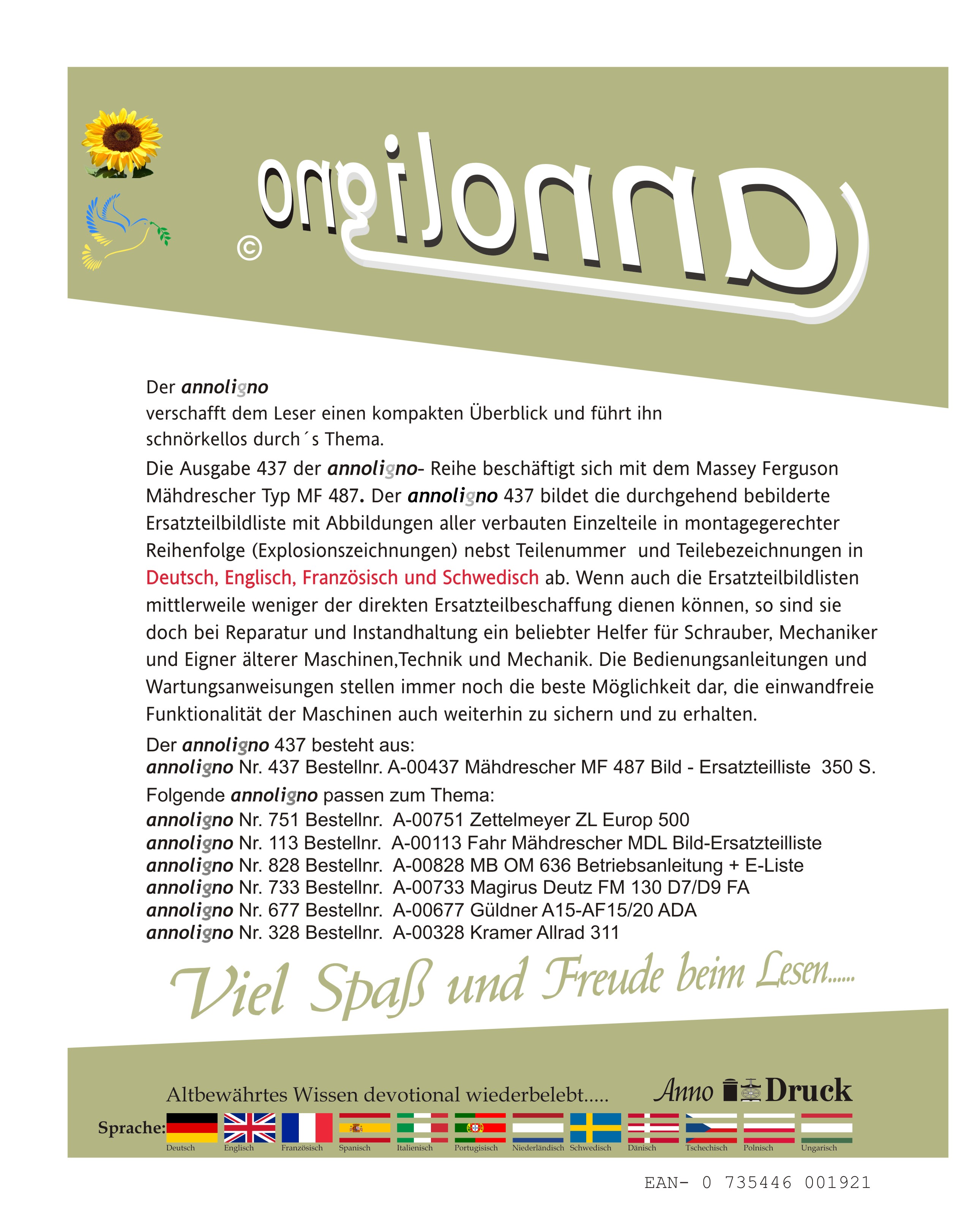Massey Ferguson Mähdrescher Typ MF 437 Bild Ersatzteilliste mit Explosionszeichnungen in 4 Sprachen - annoligno 437