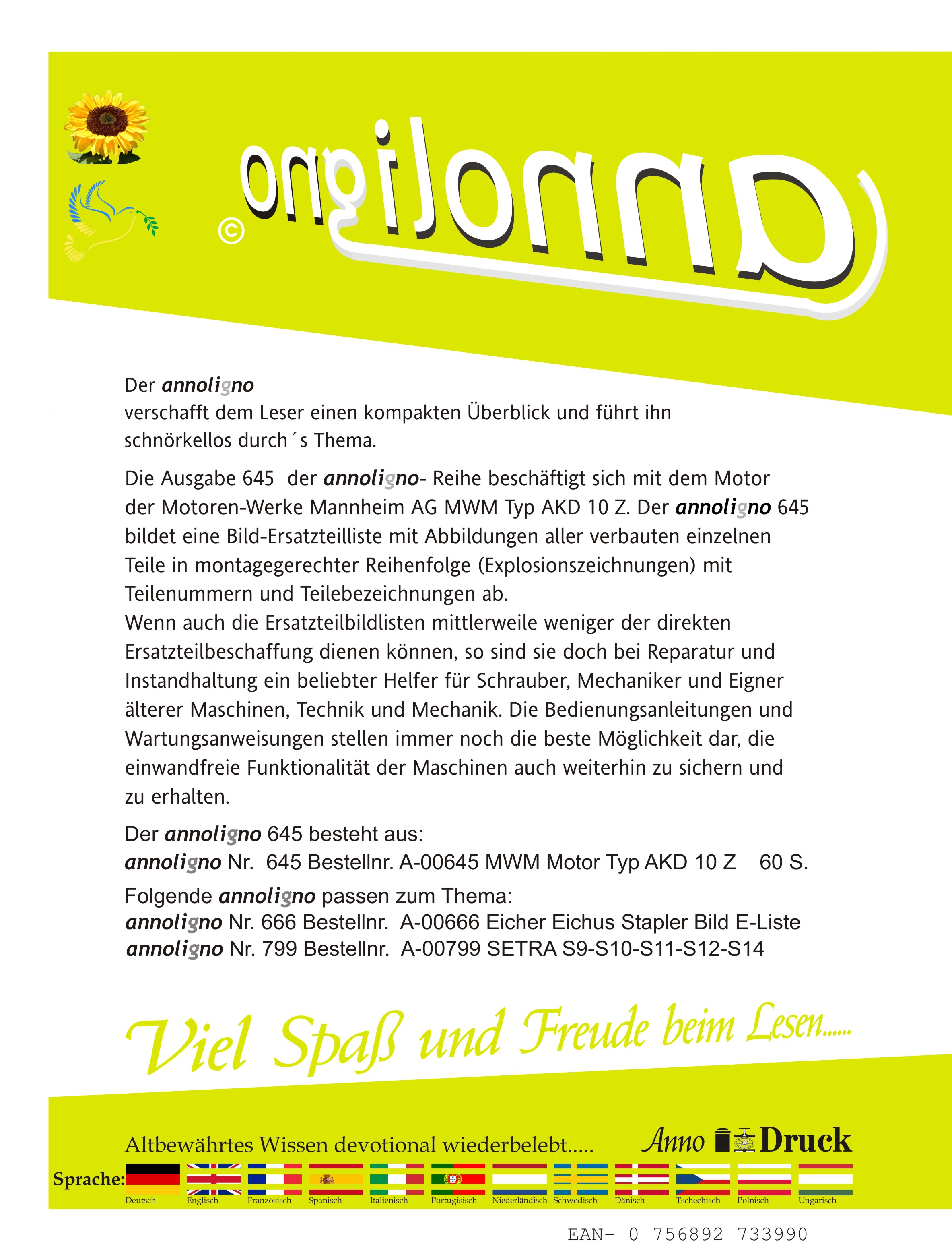MWM Motorenwerke Mannheim AG Motor Typ AKD 10 Z Bild- Ersatzteilliste & Explosionszeichnungen - annoligno 645