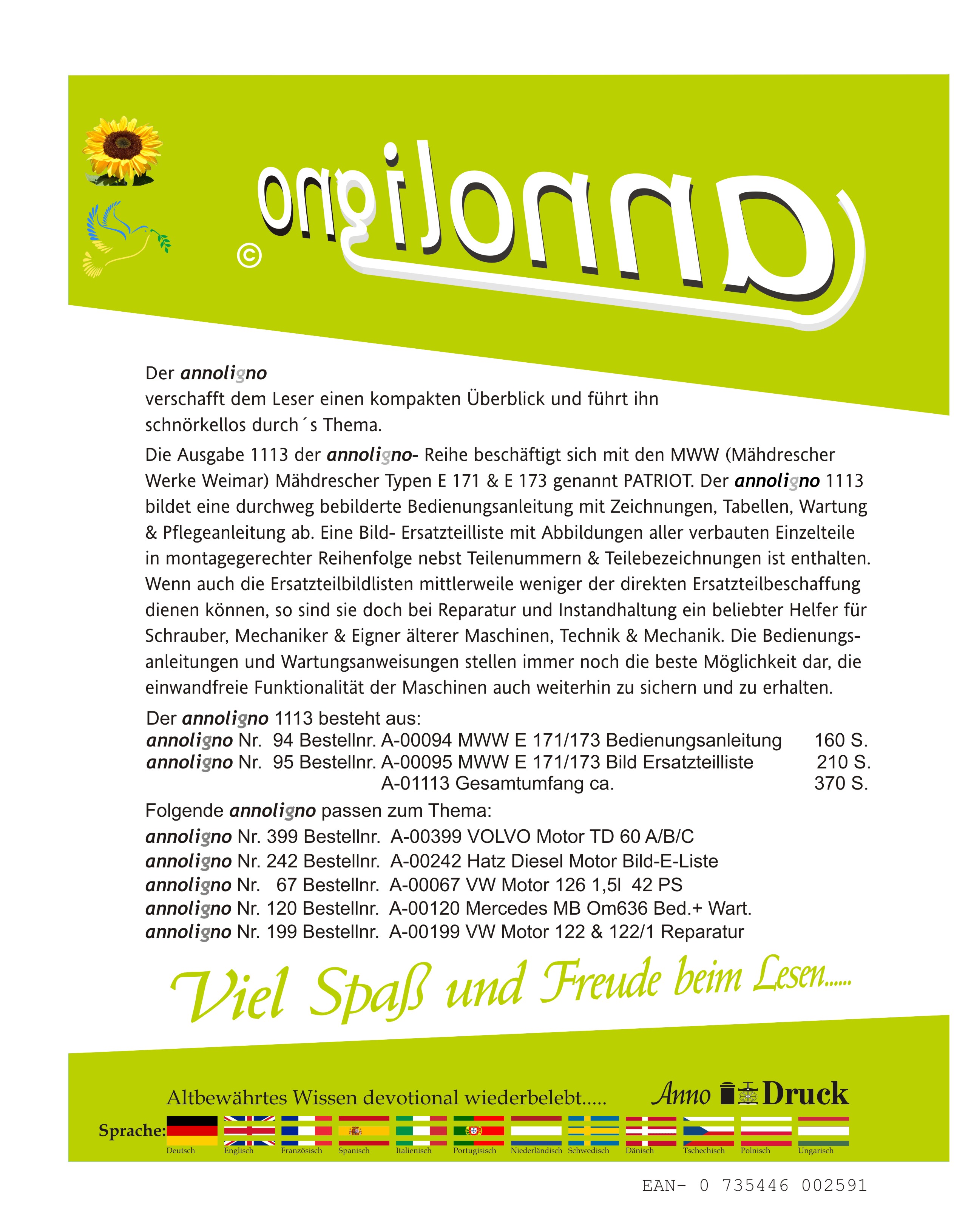 MWW Mähdrescher Typen E 171 & E 173 Patriot Bild- Bedienungsanleitung & Bild- Ersatzteilliste mit Explosionszeichnungen - annoligno 1113