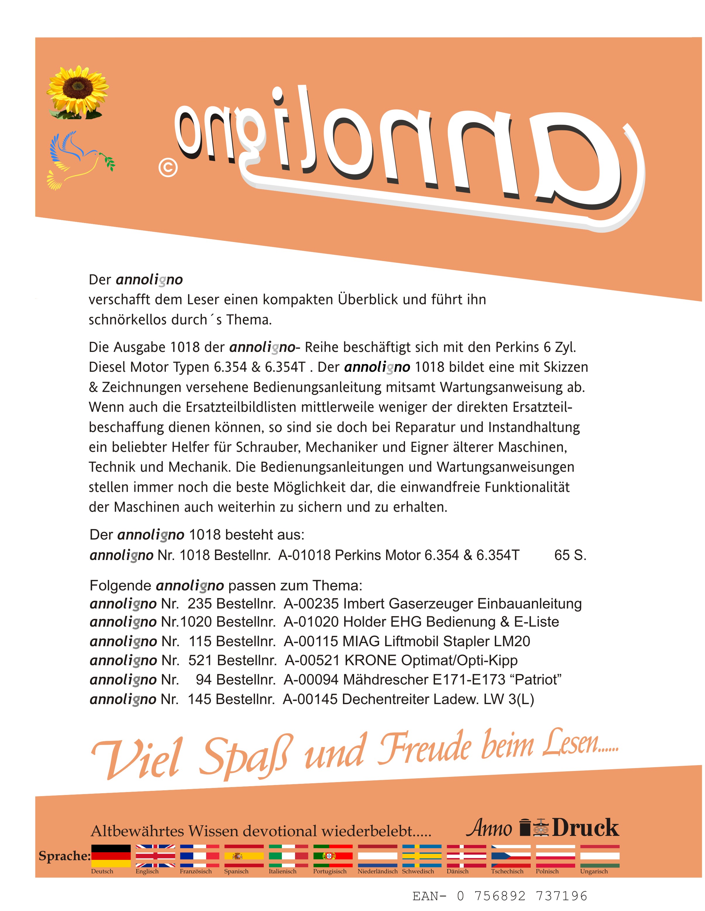 Perkins 6 Zylinder Diesel Motor Typen 6.354 & 6.354 T Bild- Bedienungsanleitung & Wartungsanweisungen - annoligno 1018