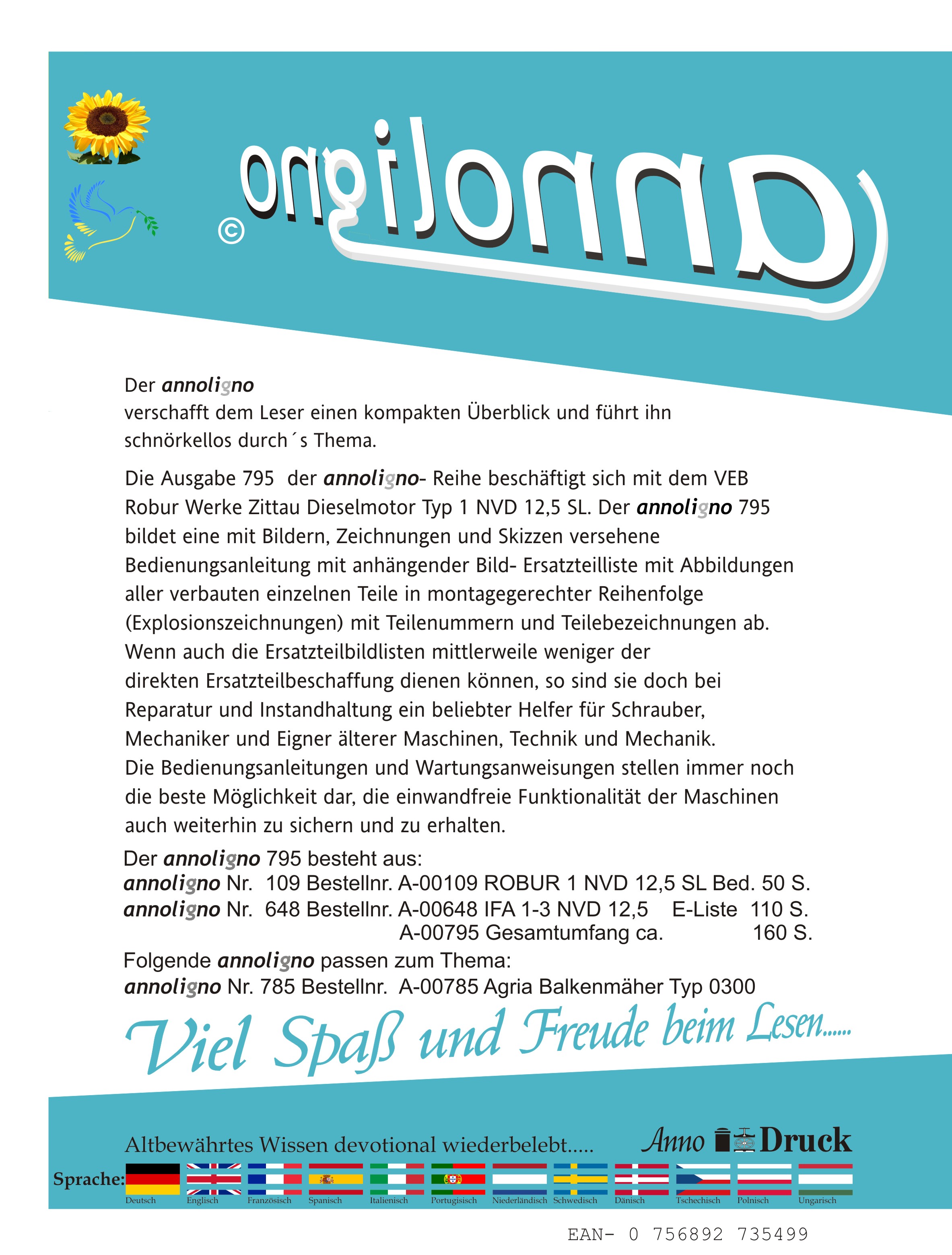 ROBUR Werke Zittau Diesel Motor Typ 1 NVD 12,5 SL  Bild- Bedienungsanleitung & Bild- Ersatzteilliste & Explosionszeichnungen  - annoligno 795