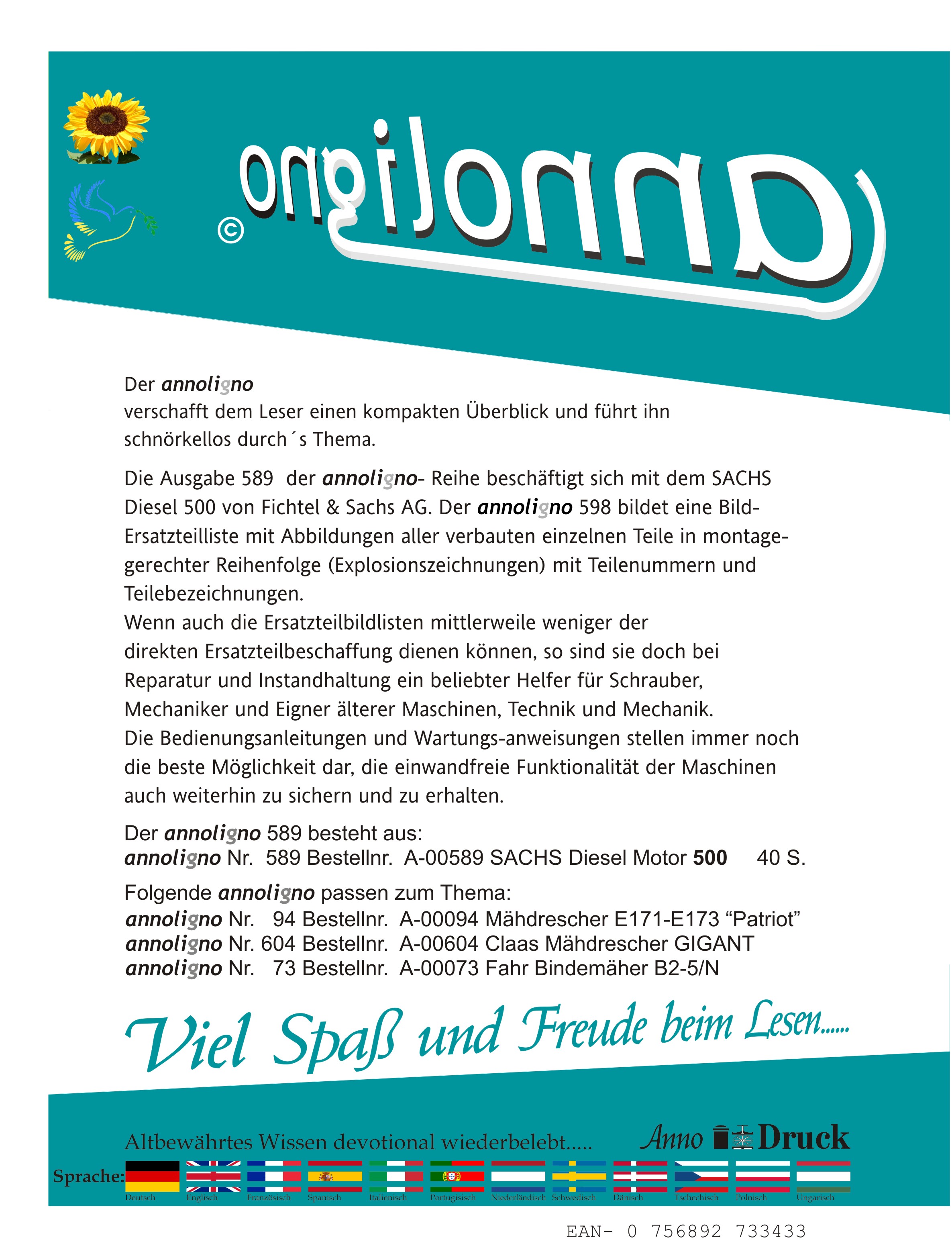 Fichtel & Sachs Diesel Motor Typ 500 Bild- Ersatzteilliste & Explosionszeichnungen - annoligno 589