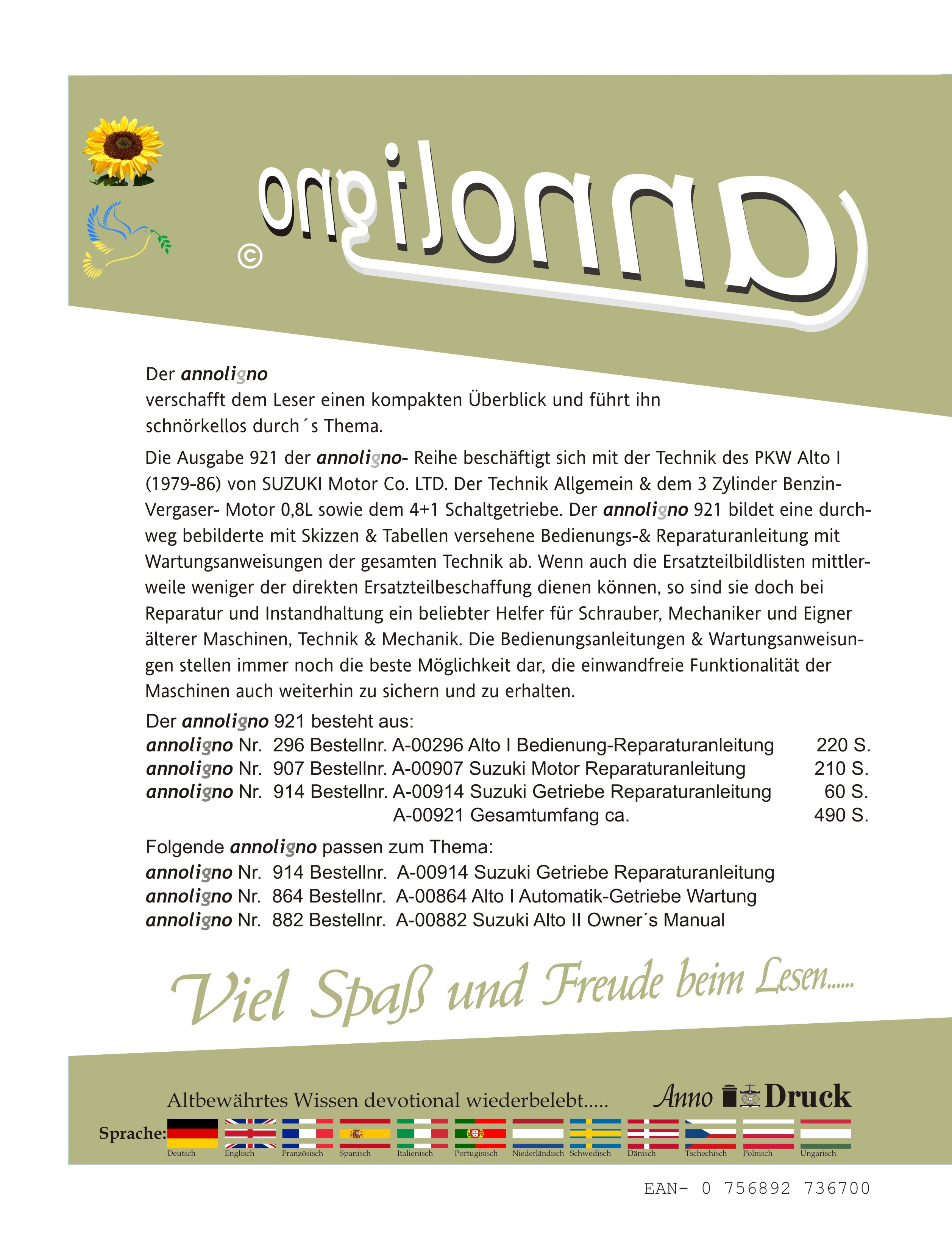 SUZUKI PKW Typ Alto I & 3 Zylinder 0.8l Benzin Motor & Getriebe/Schaltgetriebe Werkstatt Bild- Reparaturanleitung/Handbuch - annoligno 921