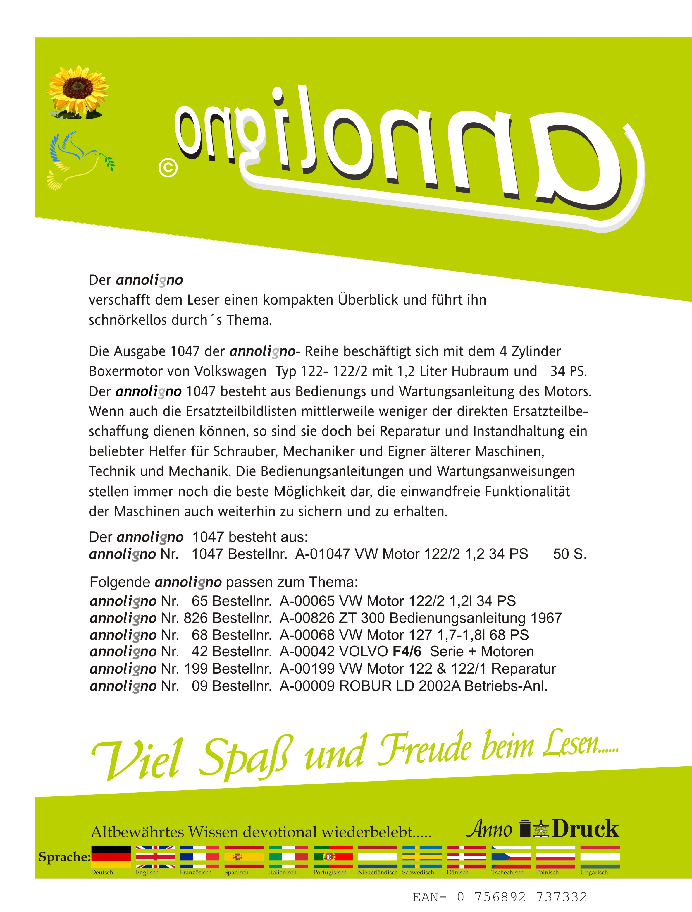 Volkswagen VW 4 Zyl. Boxermotor Typ 122- 122/2 Bild- Bedienungsanleitung & Wartungsanleitung - annoligno 1047